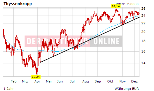 Auch wenn kein größeres Aktienrückkaufprogramm den Kurs derzeit unterstützen wird, sind die Papiere des DAX-Konzerns aussichtsreich. Der konjunktursensible Titel dürfte in den kommenden Monaten von sich weiter verbessernden wirtschaftlichen Rahmenbedingungen profitieren. Dazu dürften auch die verbesserten Aussichten in der Autoindustrie ihren positiven Beitrag leisten. Noch nicht investierte Anleger nutzen die Gelegenheit und bauen eine erste Position in ThyssenKrupp auf.