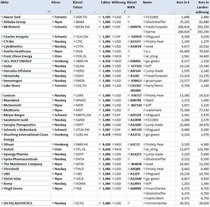 Ich bitte euch allerdings alle, mir die Arbeit zu erleichtern, indem ihr alle geforderten Angaben selbst raussucht, insbesondere die richtigen Yahoo-Finance-Kürzel.