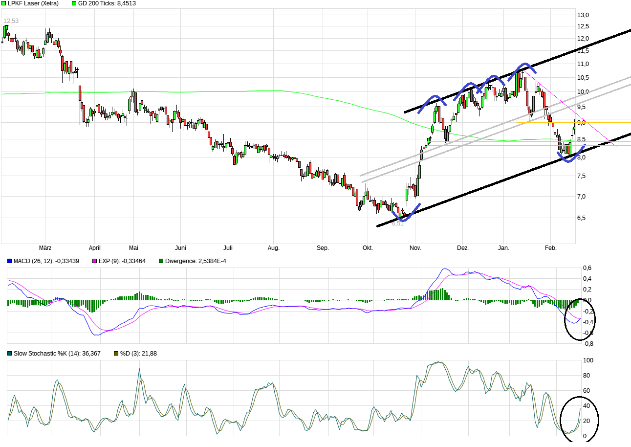 In einem guten Gesamtmarktumfeld (DAX mit neuem ATH heute), wo viele Tech-Werte in der letzten Zeit wieder gut anziehen, positionieren sich spekulativ offensichtlich wieder Trader/Zocker kurz vor den bald anstehenden LPKF Zahlen (21.03.2024 08:00Uhr) und hoffen auf irgendwas Erbauliches was weiter anschiebt. Warten wir ab was man bieten wird an Zahlen & Prognosen. Indikatoren drehen auch nach oben. Die 200 Tagelinie wurde auch wieder überschritten. Und  vermutlich hofft man darauf, daß nun der schwarze Aufw.trendkanal intakt bleibt, eine Art Boden vorgibt und man ab jetzt wieder von der Unterseite zur Oberseite pendelt.