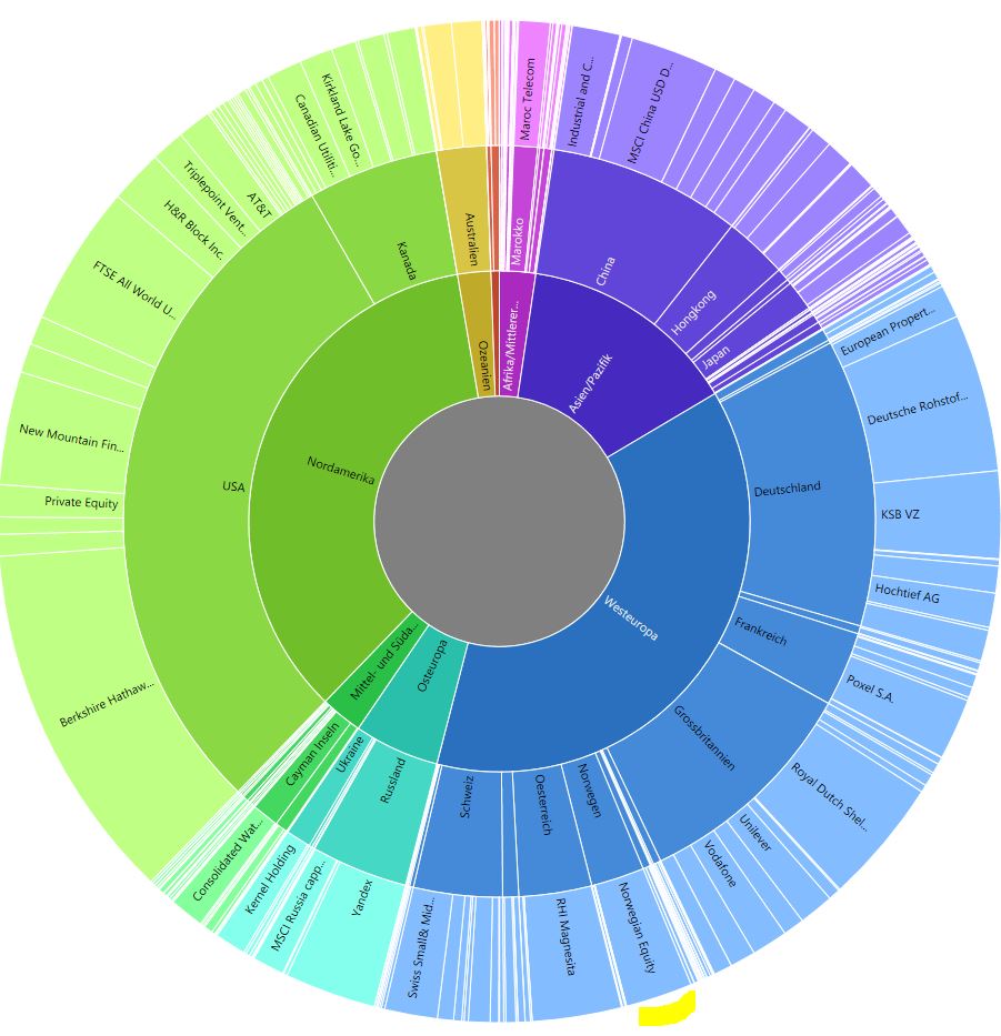 Eigentlich hatte ich vor, ihn bis 2025 weiter zu besparen. Doch als Thesaurier ist er eine Ausnahme von der Umorientierung in Richtung laufende Erträge, die ich Anfang 2021 für das Depot eingeläutet habe. Noch habe ich allerdings keine ausschüttende Alternative gefunden, also lasse ich ihn erst mal weiter laufen, bis dem - vielleicht - irgendwann mal so ist. Im Depot ist er aktuell so gewichtet wie unten abgebildet, s. gelbe Außenmarkierung: