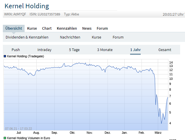 Sonnenblumenöl wird auch künftig noch gebraucht und ist ein absolut friedliches Geschäft. Sollte die Lage sich beruhigen, bleiben auch die von mir gefürchteten Plünderungen oder gar Verstaatlichungen ukrainischer Unternehmen aus. Zwar kann man die Dividende wohl erst mal für ein oder zwei Jahre knicken und auch mit großen Kurssprüngen rechne ich erst mal nicht. Aber mittel- bis langfristig könnte Kernel einen erheblichen Turnaround hinlegen.