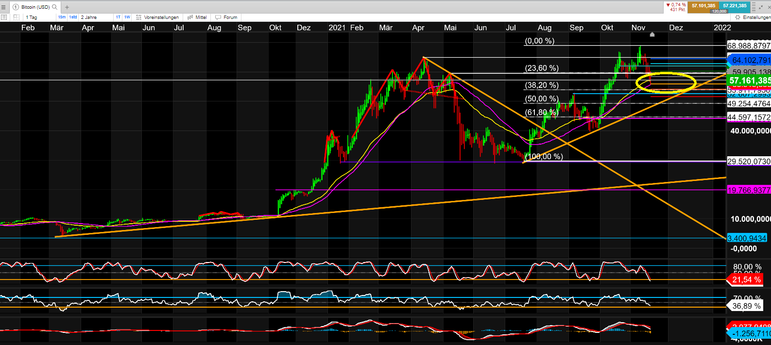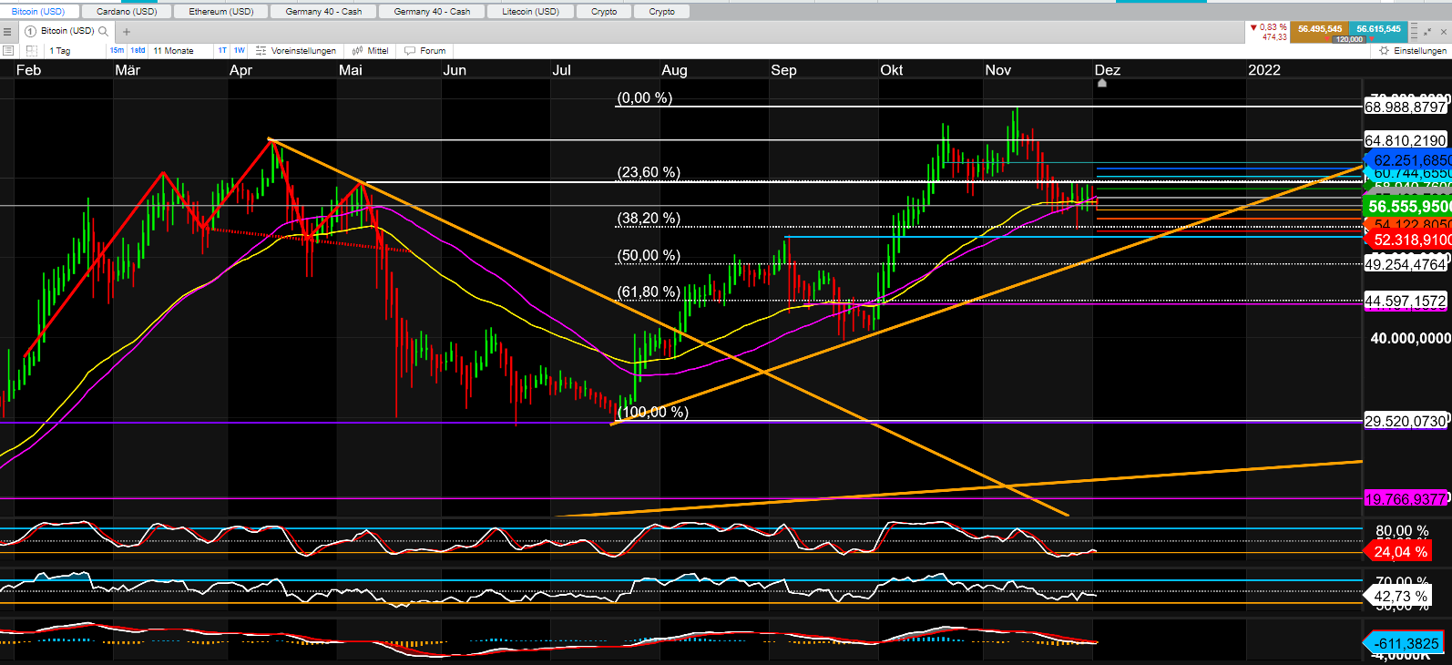 hat das in Post#372 gelb eingekreiste Korrekturziel erreicht und EMA+SMA erreicht, ebenso das eingezeichnete 23,8 Retracement. Das 38,2er Retracement bei ca. 53900/54.000$ könnte durchaus auch noch abgearbeitet werden. Dieser Bereich sollte dann halten, sonst sind auch 49.200$. Darunter würden dann die Bereiche um 44600$, 40000$ und 29500$ winken, so schwarz möchte ich aber nicht malen, es wäre aber möglich.