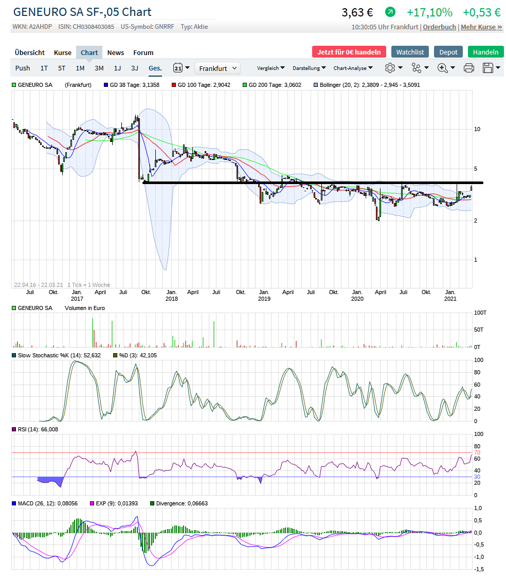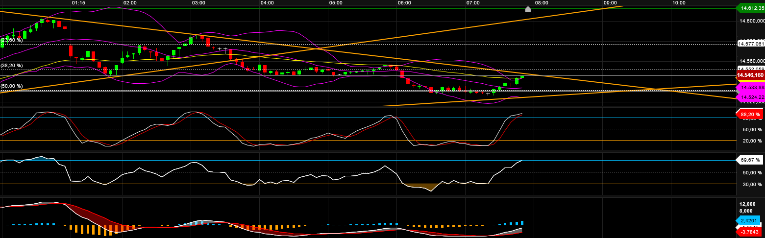Heute nochmal der Xetra-Dax: In der Tat kam gestern Dynamik rein. Wie vermutet, ging es erstmal runter in den Bereich um 14420. Anschließend folgte ein Rücklauf zum Ausbruchsniveau in den Bereich von 14520. Statt dann wieder nach unten abzudrehen und in meinen persönlichen Zielbereich in den Bereich von 14200 zu laufen, legte der Dax ein erstklassiges Reversal hin und schloss im Bereich 14620 und zog außerbörslich weiter nach oben. Die Tageskerze von gestern deutet an, dass es nun zunächst noch weiter nach oben gehen könnte in den Bereich 14800/14850 oder sogar bis zum oberen Bollinger in den Bereich um 15000, womit wir ein neues ATH erzielen würden. The Trend is your friend - alte Regel.