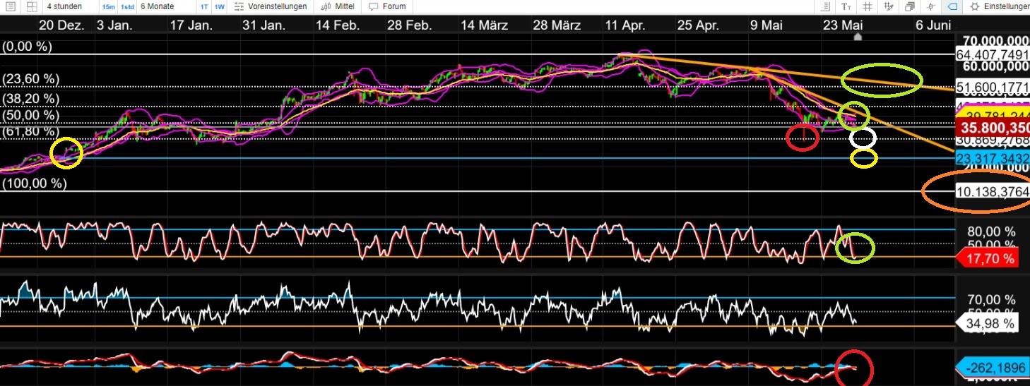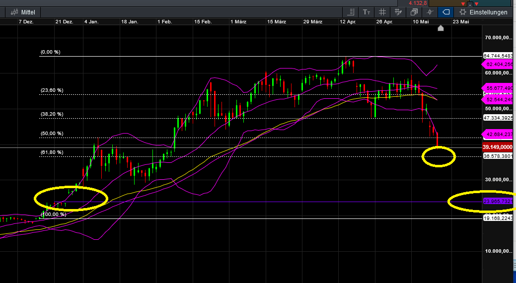 Das 61,8er Retracement der BIG RALLEY wurde ja bekanntlich vor einigen Tagen abgearbeitet. Von da aus ging es zügig an die 40.000$ Marke, und dann wieder zurück in den Bereich unter 35.000$.