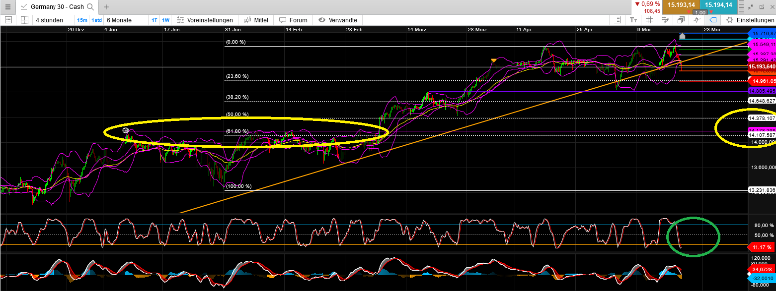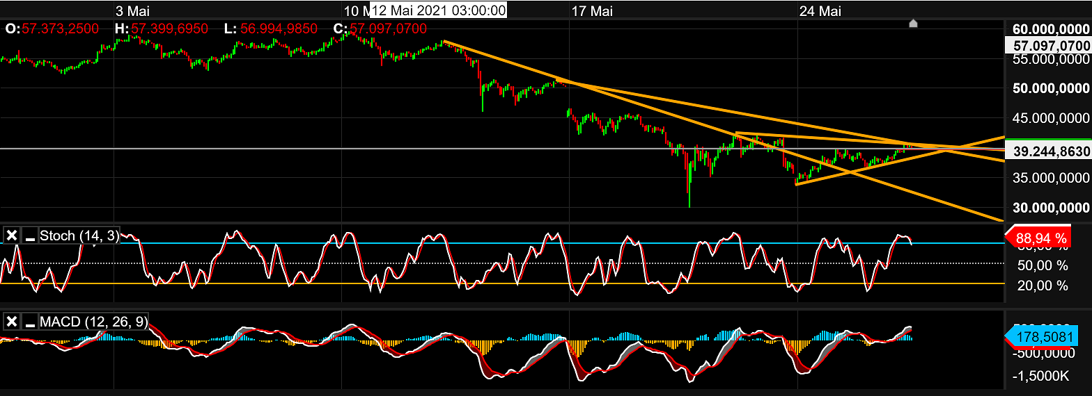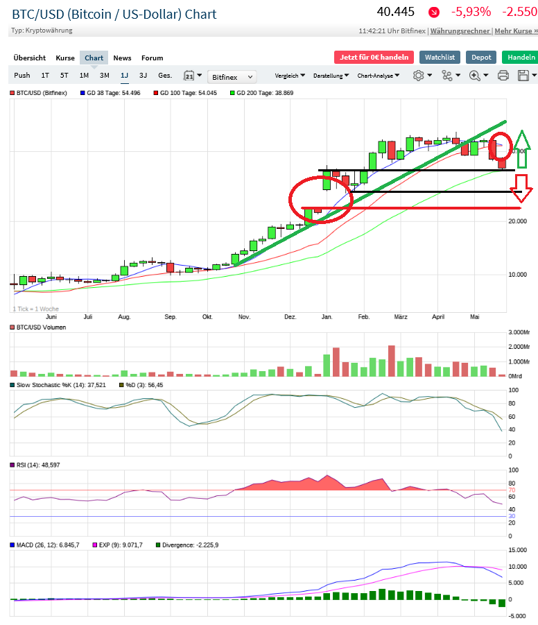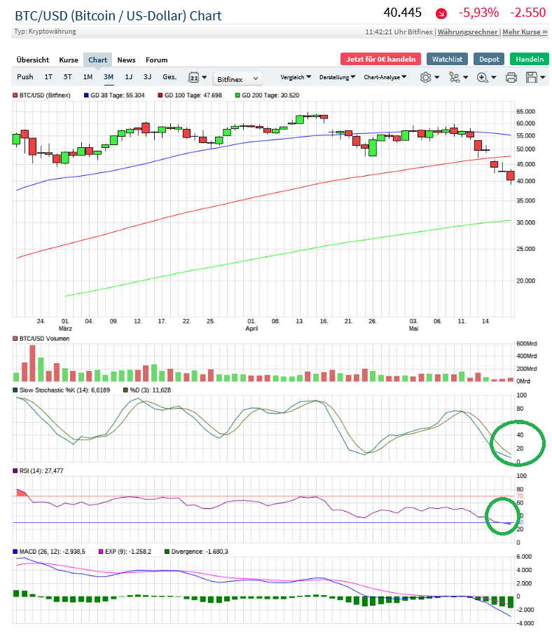 Fakt ist, das der Bitcoin sich seit Mitte April in einem Abwärtstrend befindet. Der MACD hat ein Verkaufssignal geliefert, welches immer noch aktiv ist. Jedoch ist der SlowStoch schon ordentlich abgekühlt, so das langsam mal wieder eine Aufwärtsbewegung folgen könnte, was jedoch nicht eintreten muss.
