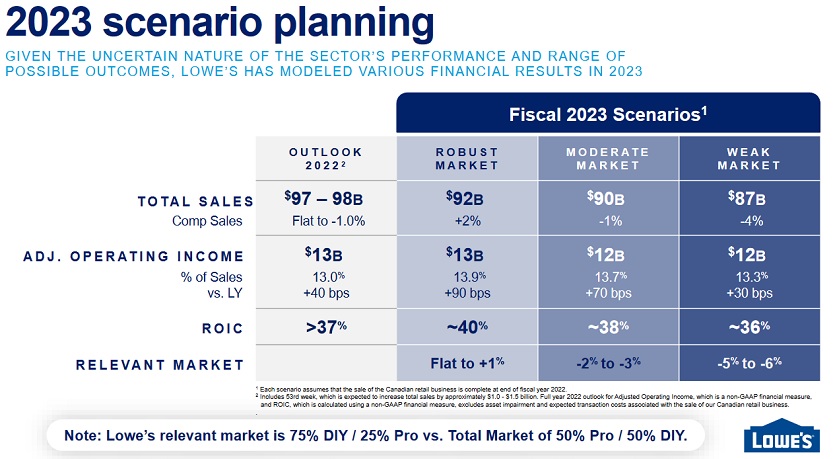 Die professionellen Bauunternehmer machen nur 20 bis 25 % der Einnahmen aus. Nicht, dass Lowe’s dieses Segment seiner Geschäftstätigkeit nicht gestärkt hätte, aber es ist in der Lage, den Stürmen besser zu trotzen, weil es sich auf Hausbesitzer konzentriert.