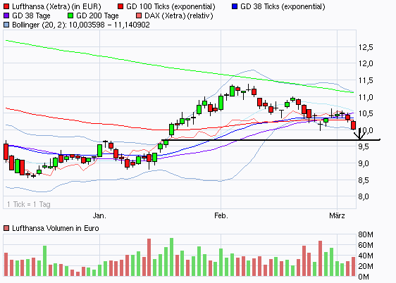 Wie bereits geschrieben wird das Kursziel der nächsten Tage die Schließung des Gaps inkl. Bestätigung der unteren Trenkanallinie sein. Durchaus denkbar, dass der Kranich nunmehr in den Erholungsmodus geht. Jedoch sind Kurse bis 10,60 weiterhin ein Abwärtstrend! Erst der Bruch der Linie auf SK erzeugt ein erstes Kaufsignal. Sollten wir heute so enden, wie es aktuell aussieht, haben wir eine schöne rote Kerze die einen SK ausserhalb der gestrigen bildet. somit dürften grundsätzlich weitere Abverkäufe (zumindest zu Handelsbeginn am Dienstag) folgen. Weitere Shorties werden ich wohl unter 10 platzieren... LH hat ordentlich das Bollinger perforiert und wird (so wie es derzeit aussieht) auch außerhalb schließen. Somit wird das Band nach unten geweitet und bietet weitere Tiefstkurse. RSI dreht langsam Richtung Extrembereich. Wenn also LH keine Korrektur vollzieht oder sie in die Seitwärtsbewegung eintritt, könnten theoretisch ab Übermorgen die ersten Kaufsignale erzeugt werden, da sie langsam in den überverkauften Bereich fliegt. Die 10 Euro ist für mich persönlich nur eine Zahl - sie hat im Chart aktuell keine besondere Bedeutung - außer ggf. eine Psychologische...