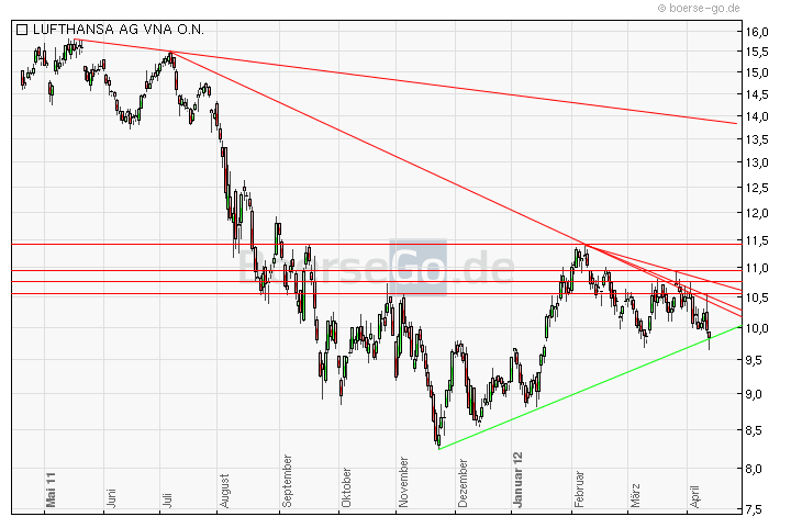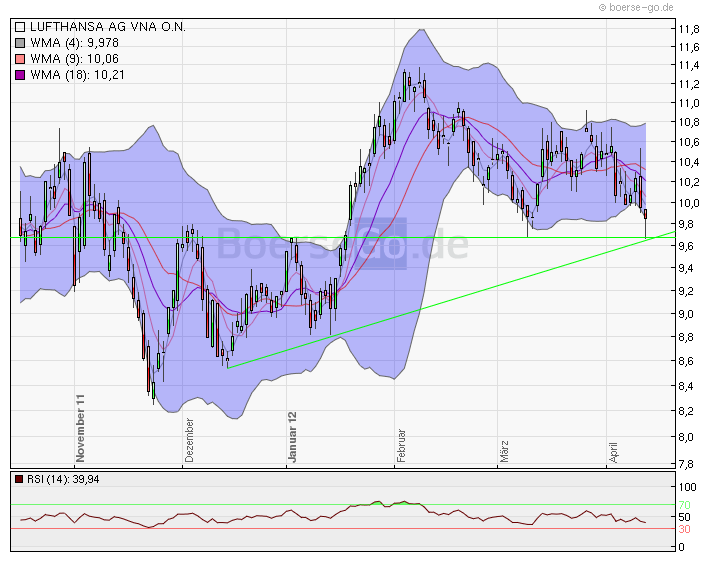 Prognose: weiterhin schwierig. Ein Einstieg auf dem Tief war heute durchaus sinnvoll (ärgerlich um den SL, was solls...), da Kauf analytisch begründbar gewesen ist. Der bullish hammer wäre erst mit Bestätigung am Folgetag (also Morgen) zum SK ein Kaufsignal. Der Stop muss dann jedoch folglich unter der heutigen gesetzt werden. Viel Platz ist jedoch nicht nach oben, da wir uns in einem Abwärtstrend befinden. Der Deckel wartet auf dem gestrigen Hoch bei 10,525. Ein Bruch dieser Marke wird intraday Kaufsignale auslösen. Defakto muss egal ob LH diese Marke nun direkt nimmt oder nicht, ein Zwischenhoch für einen neuen Aufwärtstrend generiert werden. Alternativ kehrt sie nach kurzem Anstieg auf die heutige Unterstützungslinie zurück um dann die 10,525 in Angriff zu nehmen. Ein weiterer Einstieg wäre möglich, sollte sich morgen ein Innenstab abzeichnen, da die Unterstützungstrendlinie und Bollinger Band begrenzend wirken werden. Stop auch dann unter dem heutigen Tief. Nach 1-2-3 liegt selbstverständlich noch KEIN Kaufsignal vor. Insofern durchwachsene Situation... |