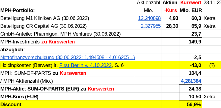 Ellis Acklin, Senior Financial & Business Analyst bei der First Berlin Equity Research GmbH, setzt in seiner "Sum‐of‐the‐Parts-(SotP)"-analyse der MPH Health Care AG vom 4.10.2022 auf Seite 6 (Table 6: MPH SotP model), https://www.mph-ag.de/files/uploads/ratings/...in_Research_Okt_22.pdf, die diskontierten Holdingkosten der MPH Health Care AG ("Present value of holding costs") mit zu hohen 43mio EUR an !