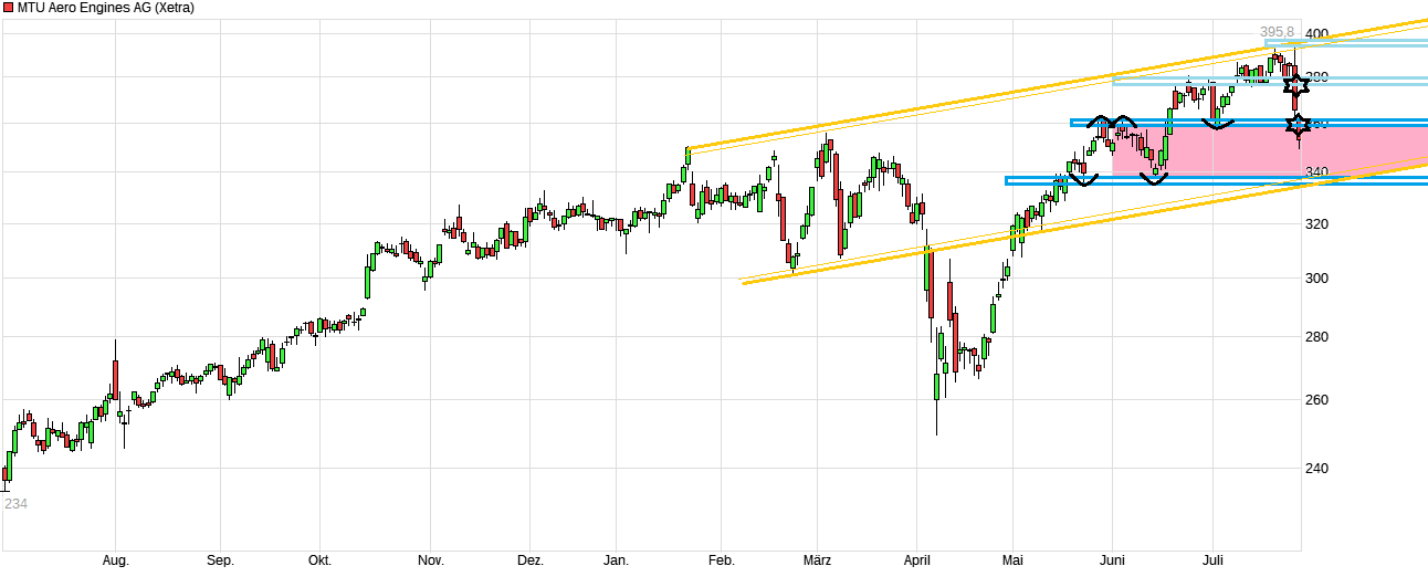 Wenn es nächste Woche zu einem Rücksetzer im Dax kommen sollte dann dürfte es somit auch MTU etwas schärfer treffen. Bei einer richtigen Korrektur tippe ich auf eine komplette Zurücknahme des Aufwärtsimpulses der vergangenen Woche. Das Mindestziel auf der Unterseite sind dann 350 Euro.