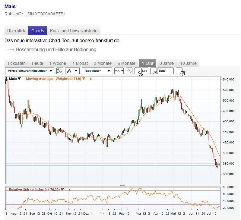 Ich bin mit einer Schnupperposi Long. Mal schaun wie das Teil sich zum Maispreis entwickelt. Der "tracking error" und die spreads sind ja oft unterirdisch, im Vergleich zum DAX. Dann noch der €/$... Habt ihr eine gute WKN für Mais?