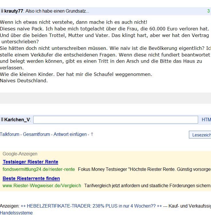 Natürlich ist jeder für sein Geld selbst verantwortlich. Wer einen Vertrag unterschreibt, wird verpflichtet. Dennoch gibt es Menschen, die nicht rational denken und ihr Vertrauen den falschen Personen schenken. Mich schmerzt die enttäuschte Gutgläubigkeit, denn sie vergiftet die Gesellschaft, aber das System funktioniert auf diese Weise, so dass sie selbst daran Schuld tragen. ----------- [...] Unmöglichkeiten sind Ausflüchte für sterile Gehirne. [...] Hedwig Dohm 1831-1919 |