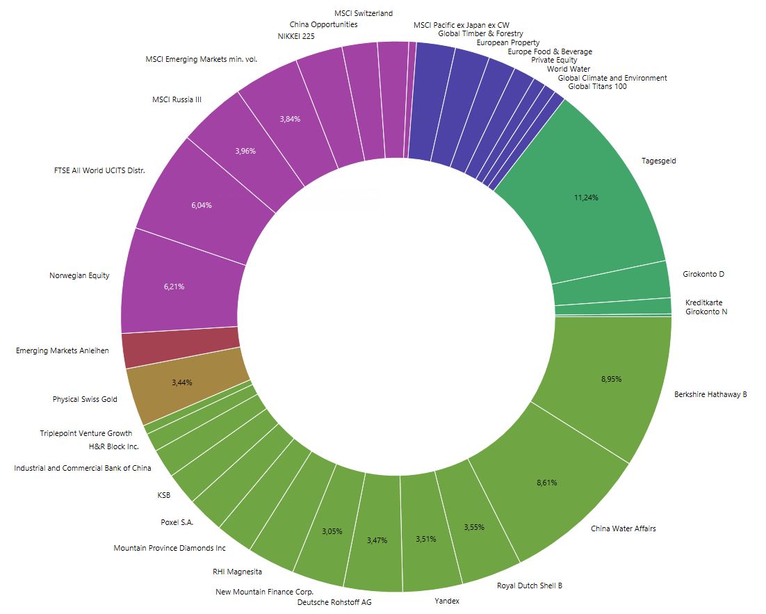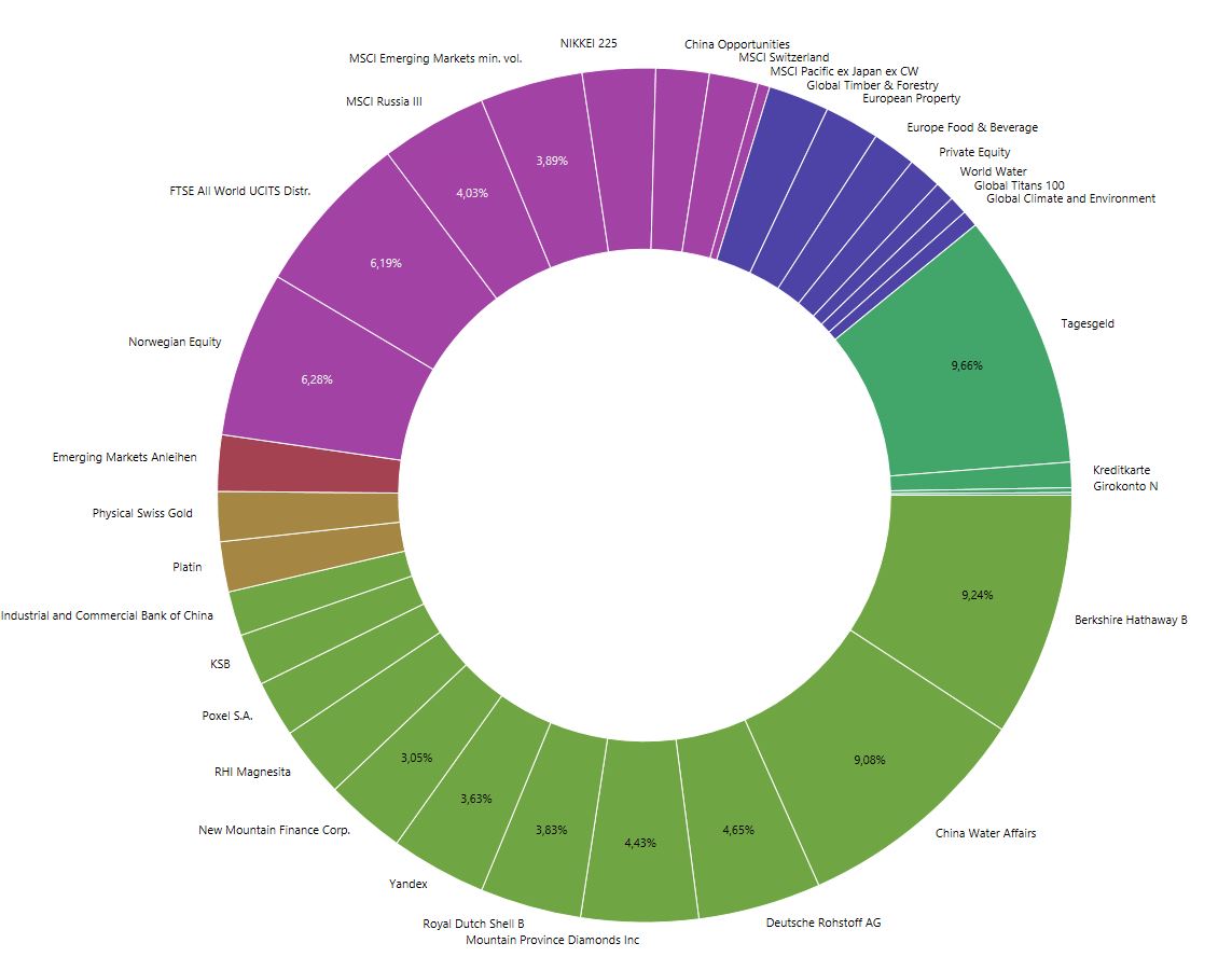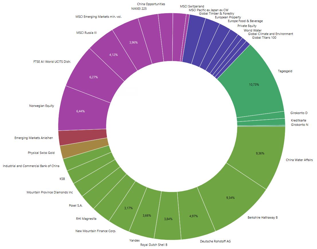 China Water Affairs und die Deutsche Rohstoff AG werde ich um die Hälfte reduzieren, sobald mich das keinen Kursverlust mehr kostet. Berkshire Hathaway sehe ich aufgrund seiner inneren Diversifizierung als eine Art Fonds, der Werte enthält, die sich im FTSE All World so nicht finden und insofern mein Depot weiter auffächern hilft. Insofern ist die hohe Gewichtung da gewollt.