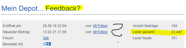 Mal was ganz anderes. Ich sehe aktuell 23.447 Zugriffe auf diesen Thread, aber auf seinen Titel (also das mit dem Feedback) geht kaum jemand je ein. Woran liegt's?