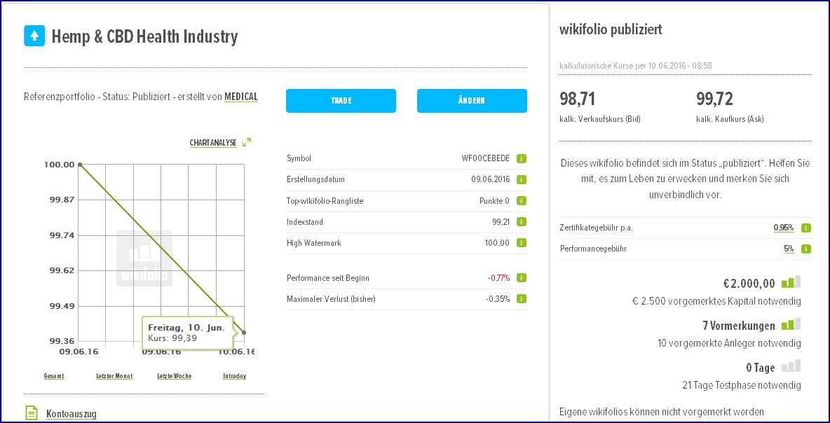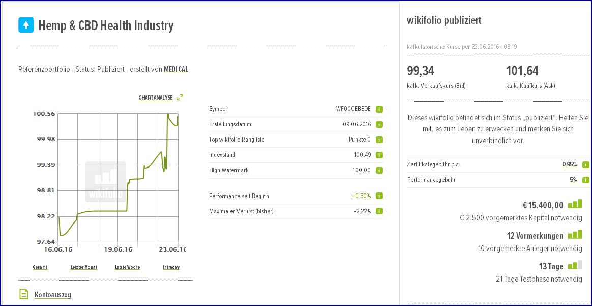 auch ich habe nun mein eigenes Wikifolio an den Start gebracht und mir fehlen nur noch ein paar wenige Vormerkugnen bis es investierbar gemacht werden kann.