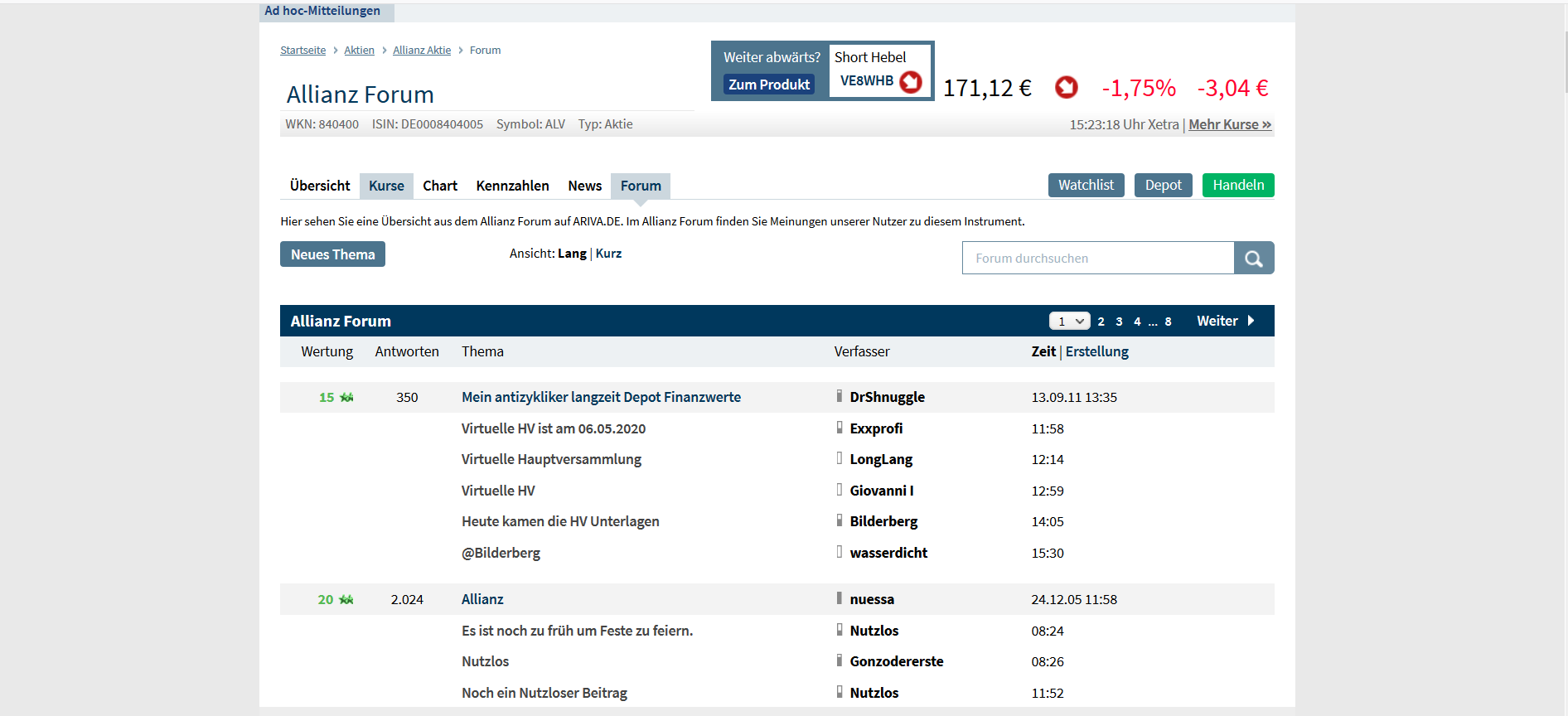 Dies ist ein virtuelles Depot und kein Disskussionthread, Zeithorizont 5 Jahre mit Verlängerungsmöglichkeit auf 10 Jahr Anfangsbetrag 12.000€ Da nur 3 Werte oben eingetragen werden können, beschränke ich mich auf diese, die ca. 33% des Gesamtdepots von 36.000€ ausmachen, da sonst zu Finanzwertlastig in Zeiten der Finanzkrise.