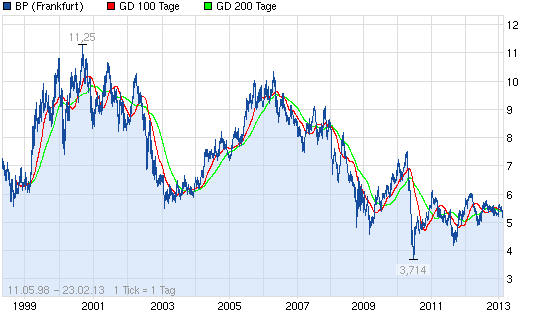 Der Ölgigant, einer der 5 weltweiten Riesen im Energiemarkt ist mit der Ölkatastrophe der Deep Water Horizon sehr ins straucheln gekommen, zumindest vom Aktienkurs her. Dennoch sind sie beim jetzigen Kurs von knapp über 5 Euro über 100 Mrd. Euro wert. Doch sind dies fast 50% weniger als vor gut 5 Jahren, obwohl die Ölpreise steigen und steigen und womit auch deren Gewinne. Und die Gewinne werden zu einem ordentlichen Anteil an die Aktionäre weitergeleitet. Doch seit der großen Katastrophe erheblich weniger. Doch eine zügige Aufarbeitung der entstandenen Kosten läßt auf eine baldige Rückkehr zur früheren Dividenpolitik vermuten. Apropos Dividenden, die werden hier vierteljährlich ausgeschüttet.