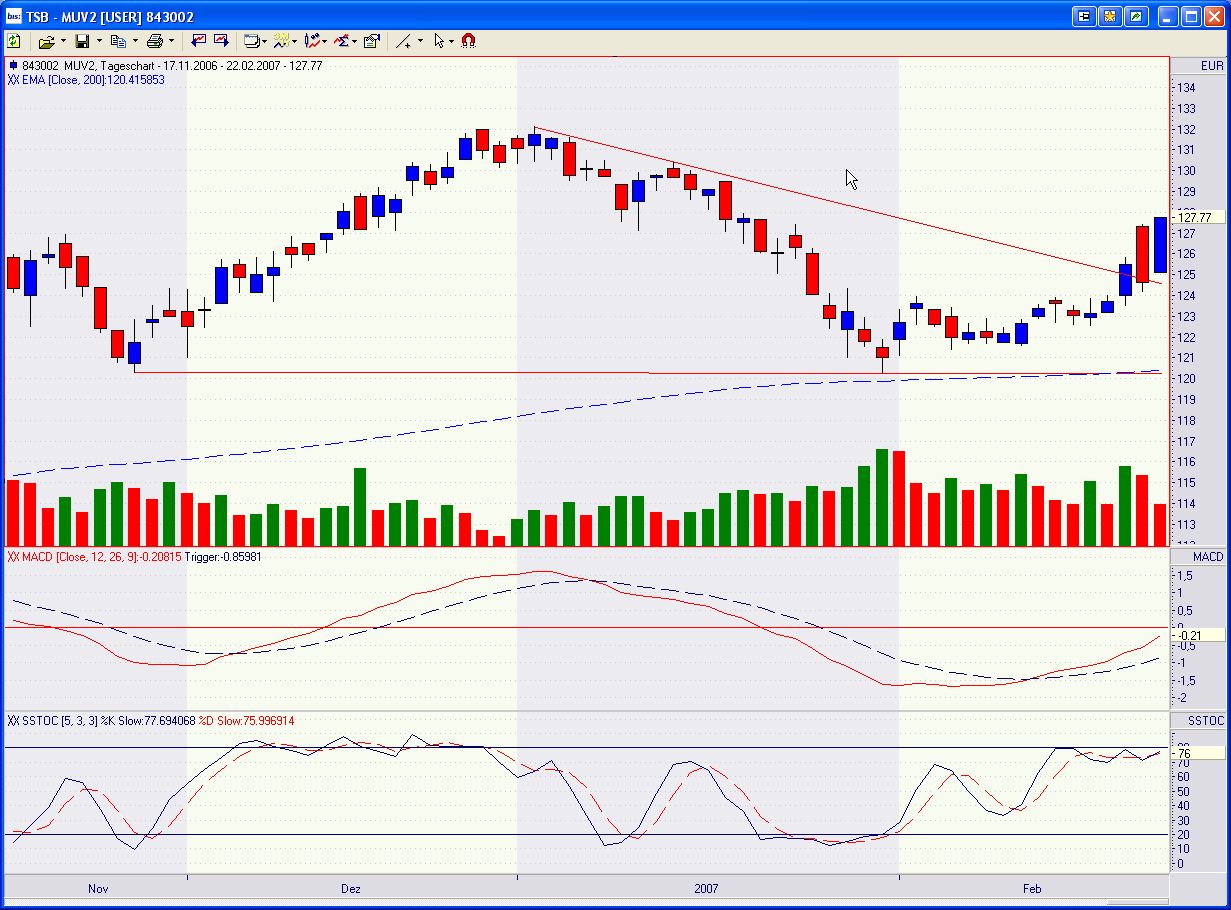 Insgesamt hat das Unternehmen im Zeitraum vom 27. November 2006 bis 22. Februar 2007 über die Börse gut 8,040 Mio eigene Aktien bzw 3,5% des Grundkapitals zum Durchschnittskurs von 124,3647 EUR je Aktie erworben, geht aus Angaben auf der Internetseite der Münchener Rück hervor. Dafür hat der Rückversicherer 999,99 Mio EUR aufgewendet.