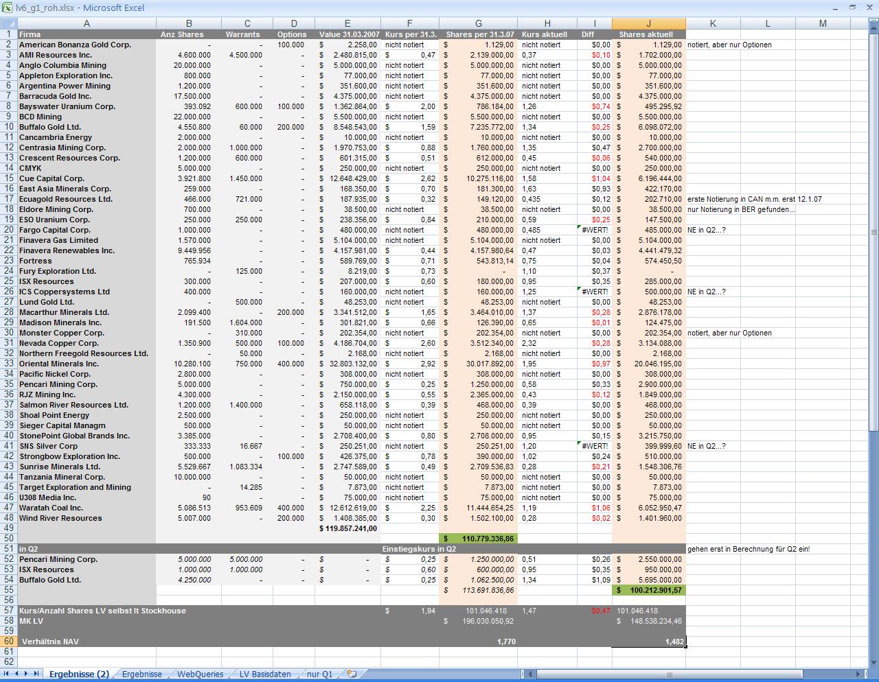 Die Bewertung des Investmentportfolios wuchs von 87,5 Mio. $ am 31.12.2006 auf 119,9 Mio. $ zum 31.03.2007.