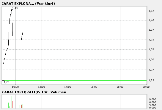 Auch das auffällig hohe Volumen in den letzten Tagen lässt auf einen schnell ansteigenden Bekanntheitsgrad der Aktie von CARAT EXPLORATION deuten. Sollten hier mehr Investoren oder Börsenbriefe auf diese Aktie aufmerksam werden, dürfte sich dies sehr schnell im Kurs der Aktie niederschlagen!