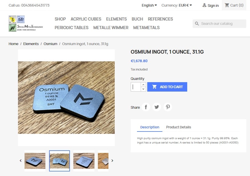 Daran besteht kein Zweifel. Osmium ist ein aufsteigender Stern in der Welt der Edelmetalle. Dieses bläuliche Edelmetall ist bereits ein Star unter den Elementsammlern und wird in den kommenden Jahren noch viel bekannter werden. Warum, was ist so besonders an ihm? Zum einen ist es viel seltener als Gold oder Platin. Es ist sogar ein Kandidat für das seltenste aller nicht-radioaktiven Elemente in der Erdkruste mit einer Verbreitung von nur einem Teil pro Milliarde. Obwohl es ein Edelmetall ist, wird es normalerweise nicht dort gefunden, wo man Silber oder Gold ausgräbt. Stattdessen wird es in winzigen Spuren aus Platinerzen gewonnen. Seine Seltenheit könnte erklären, warum es von den Industrieingenieuren ignoriert wurde, obwohl es eigentlich die Schmuck- und Edelmetallbranche beflügeln sollte. Doch das ist nicht der Fall, denn wenn es zu Pulver verarbeitet wird - und das ist der Standard bei der Veredelung -, können sich ziemlich giftige Oxide bilden. Also schmelzen Sie es einfach zu einem Klumpen und machen Sie Ringe und Anhänger daraus! Nicht so schnell. Osmium ist nahezu unschmelzbar und erfordert spezielle Laboröfen, in denen es nur in kleinem Maßstab hergestellt werden kann. Als letzter Nagel im Sarg weigern sich diese massiven Osmiumstücke, sich unter einem Hammer oder einem anderen Bearbeitungsprozess zu bewegen und zerbrechen stattdessen wie ein billiges Stück Glas.