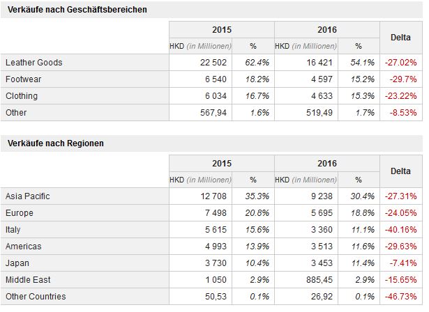 Grund ist die Abwertung der chinesischen Landeswährung Yuan zum Hongkong-Dollar, die die Waren für die Touristen aus der Volksrepublik in der Sonderverwaltungszone verteuern. Die Region Asien-Pazifik ist mit einem Umsatzanteil von rund einem Drittel der größte Markt für den Traditionskonzern aus Mailand, der allein in Hongkong 22 Filialen unterhält.