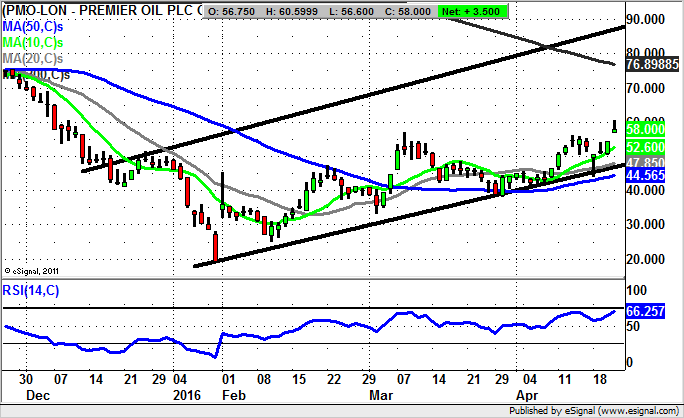 It seems difficult to believe that there could be further upside after shares of Premier Oil have tripled since the lows of the year. However, it would appear the stock is in a rising trend channel in place since December. The floor of the channel currently runs at 47p / 20 day moving average. This should mean that at least while we remain above this combination of support the top of the late 2015 price channel at 90p could be on its way over the next 1-2 months.
