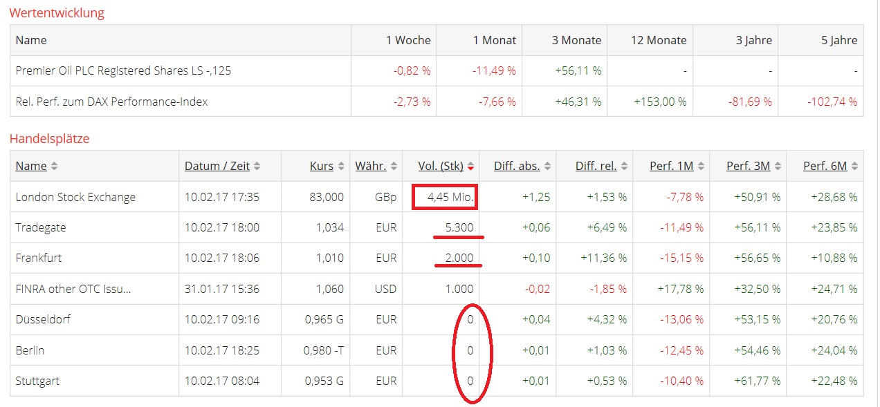 Screenshot der heutigen Umsätze - in Düsseldorf, Stuttgart und Frankfurt wurde überhaupt nix gehandelt, an den übrigen deutschen Handelsplätzen lächerliche Summen.