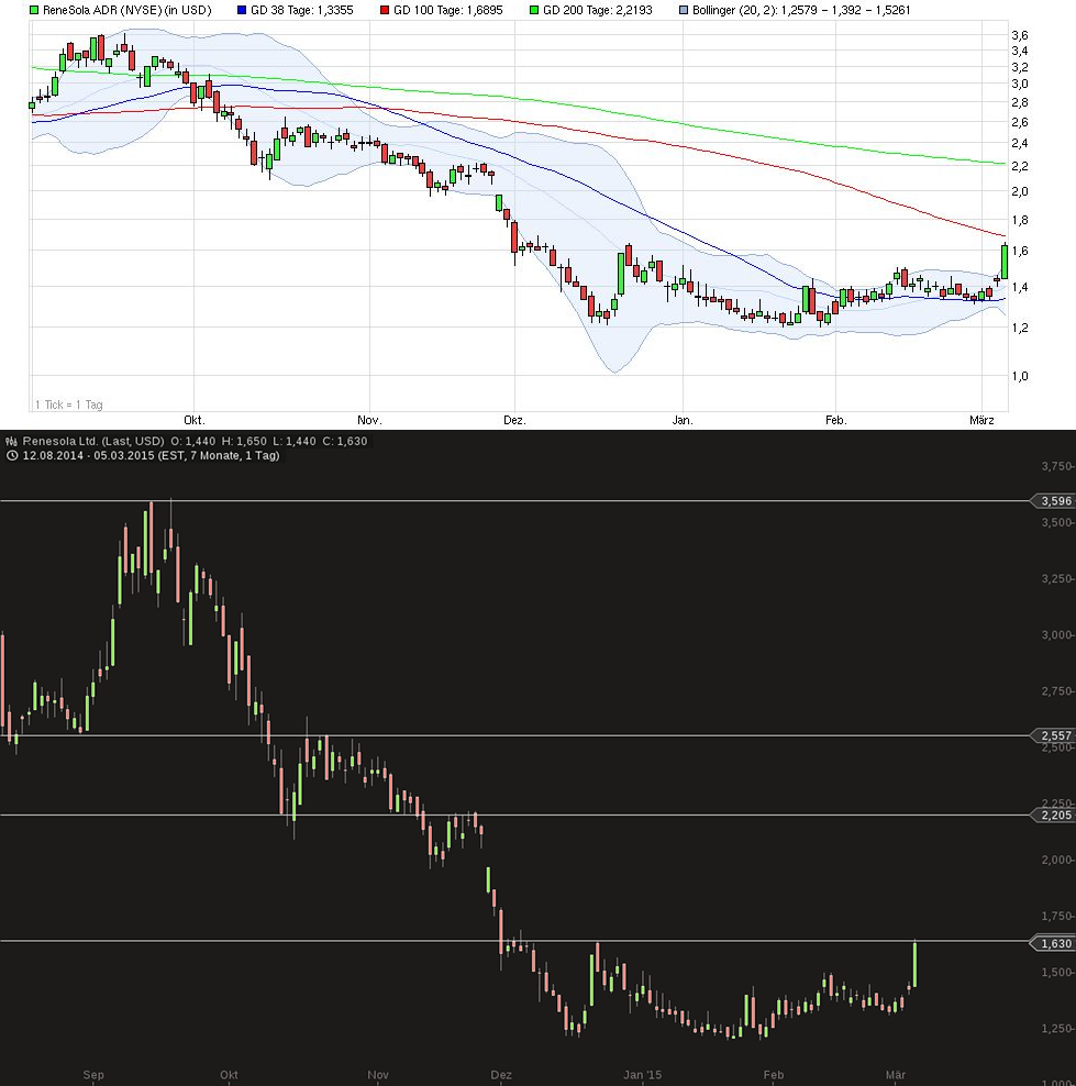 Die Aktie von ReneSola legte vorbörslich um 14,2 Prozent zu, nach Handelsbeginn geht es um 5,1 Prozent auf 1,23 USD nach oben. |