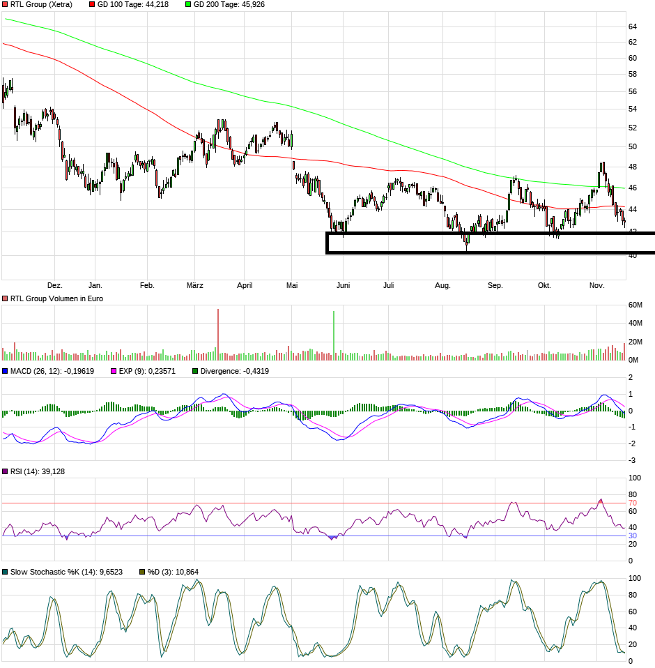 Die dann auch nochmal zu splitten halte ich nicht für sinnvoll, denn das eigentliche Investment soll ja erst noch kommen. Für Pro7Sat1 habe ich ja noch den ganzen Sommer/ Herbst über Zeit. Bei RTL ist jetzt der Abschwung stärker als ich das vermutet hatte- ich hätte sie eher einige Zeit im 44-45er Niveau gesehen, aber nicht einen neuen absoluten Tiefpunkt in den 42ern.