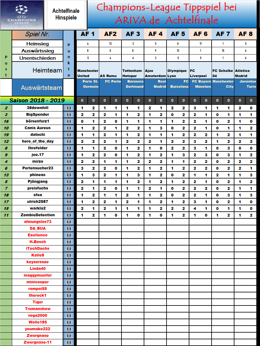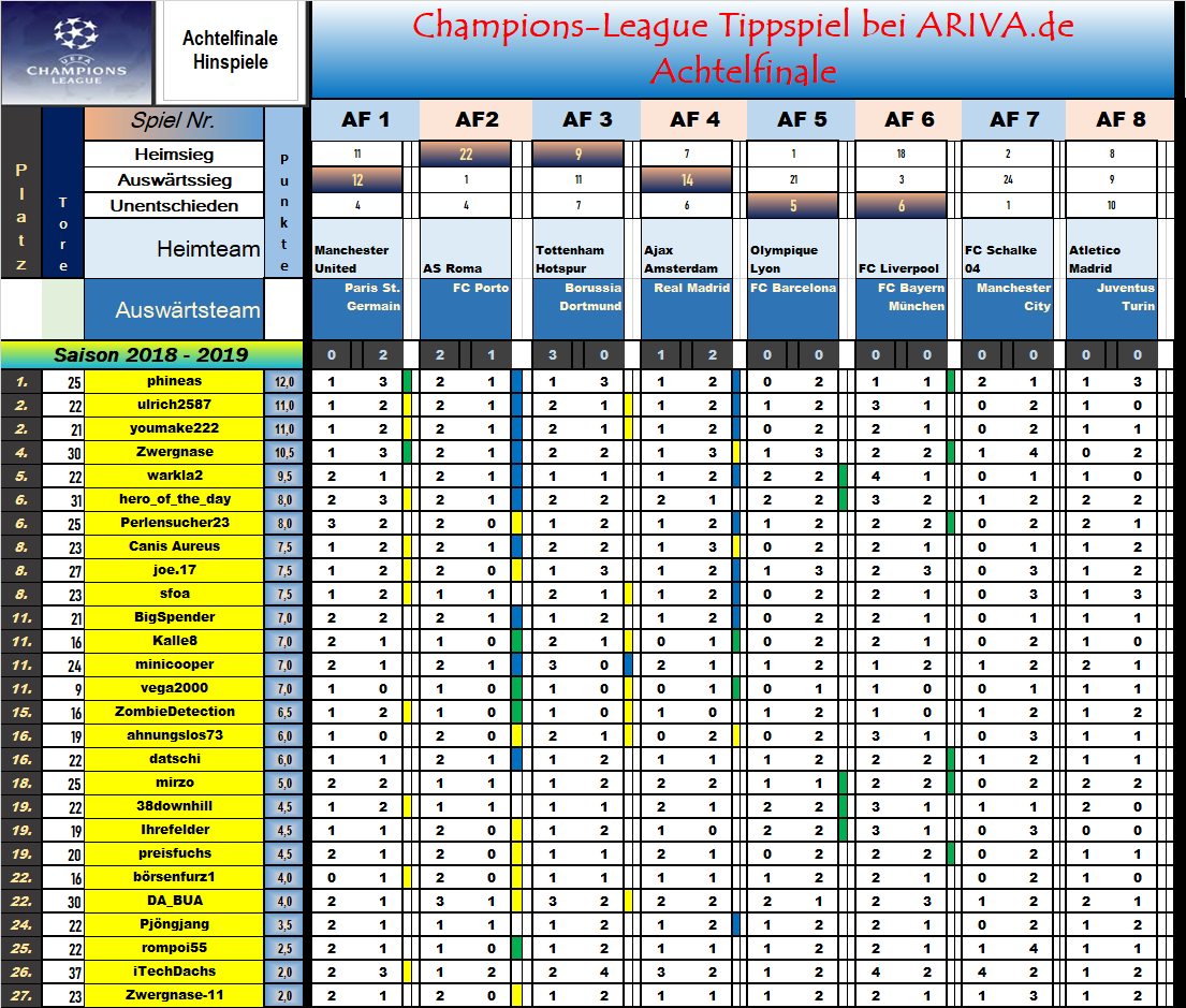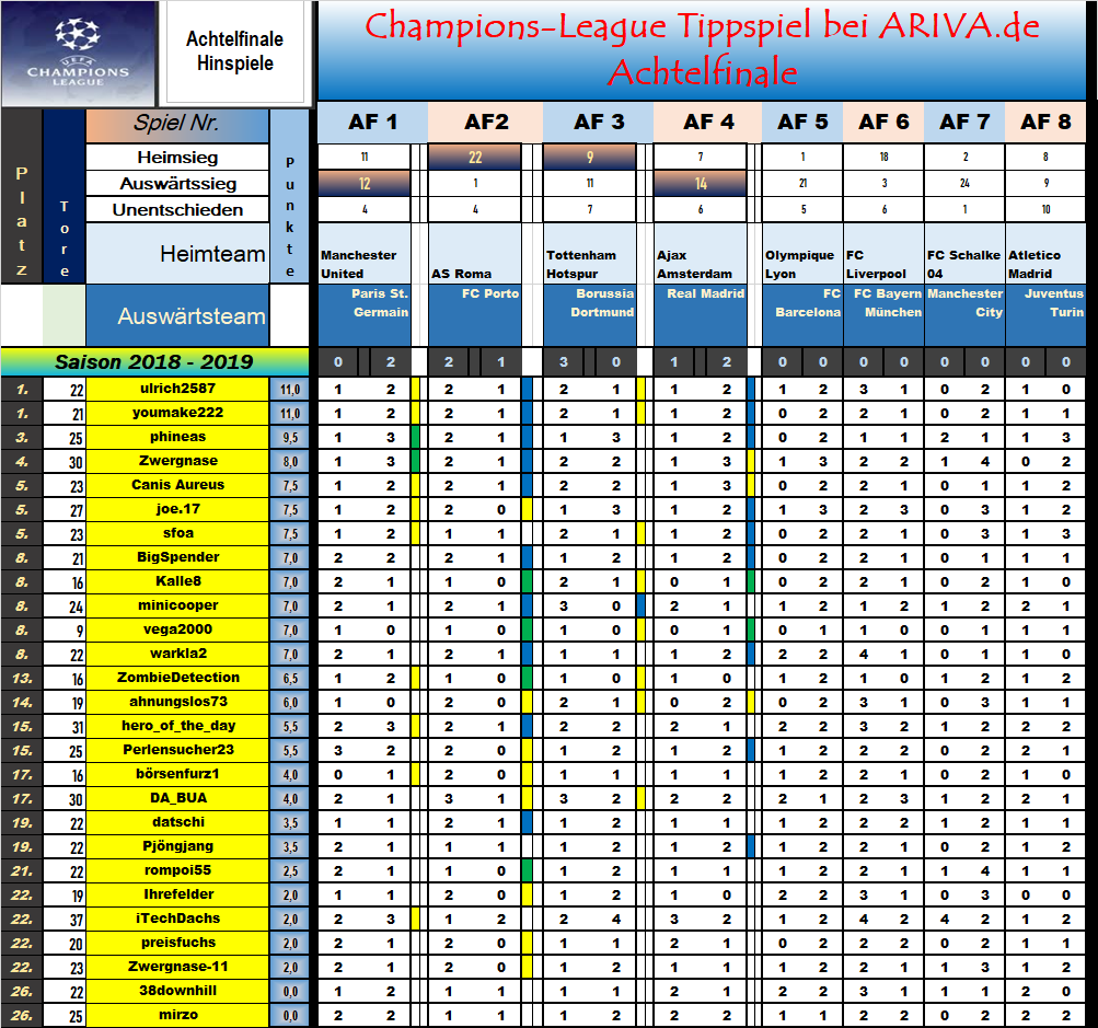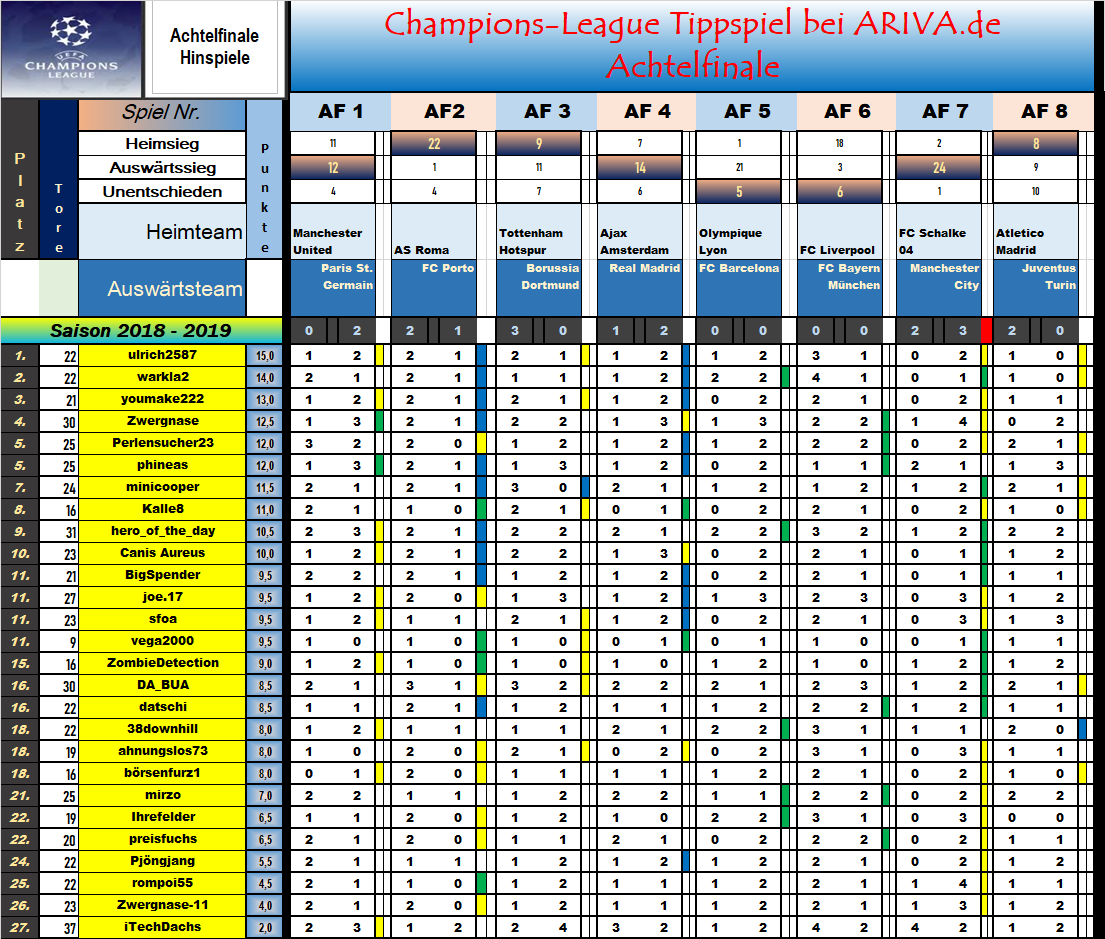 1:0 Borussia Dortmund - Tottenham Hotspur (Di, 05.03.2019, 21:00) - Rück 1:0 Real Madrid - Ajax Amsterdam 1:1 Paris Saint-Germain - Manchester United (Mi, 06.03.2019, 21:00) 1:1 FC Porto - AS Roma 1:0 Manchester City - Schalke 04 (Di, 12.03.2019, 21:00) 1:0 Juventus Turin - Atlético Madrid 1:0 FC Barcelona - Olympique Lyon (Mi, 13.03.2019, 21:00) 2:0 Bayern München - FC Liverpool |