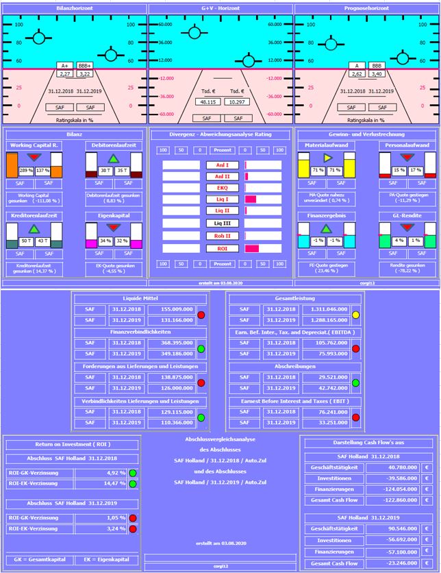 Was ist augenscheinlich: Die Bilanzratingnote hat sich von 2,62 ! auf 3,40 verschlechtert. Welche Faktoren (Kennzahlen) dazu beigetragen haben, kann an der Divergenzdarstellung abgelesen werden.