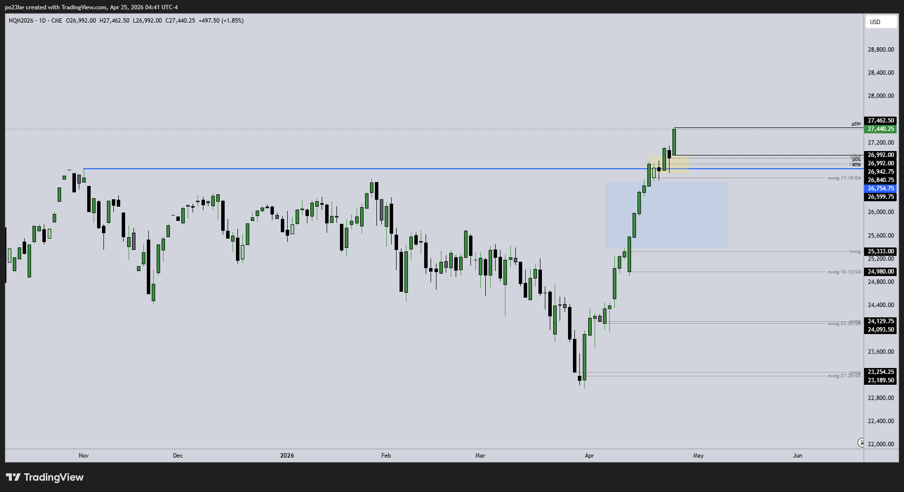 Seit dem Tief Ende März hat der Nasdaq einen fulminanten Anstieg hingelegt und das Ende ist nicht absehbar. Alle bisherigen Resist-Zonen wurden nach oben durchbrochen und im April und für das ganze April-Profil kann ich keinen einzigen roten Bereich einzeichnen. Jetzt ist auch der Future in ATH-Bereich, dort ist es eh nicht mehr möglich. Pearl hat darauf hingewiesen, dass der Monat April oft ein guter Börsenmonat ist, dieses Jahr ist dies ganz augenfällig.