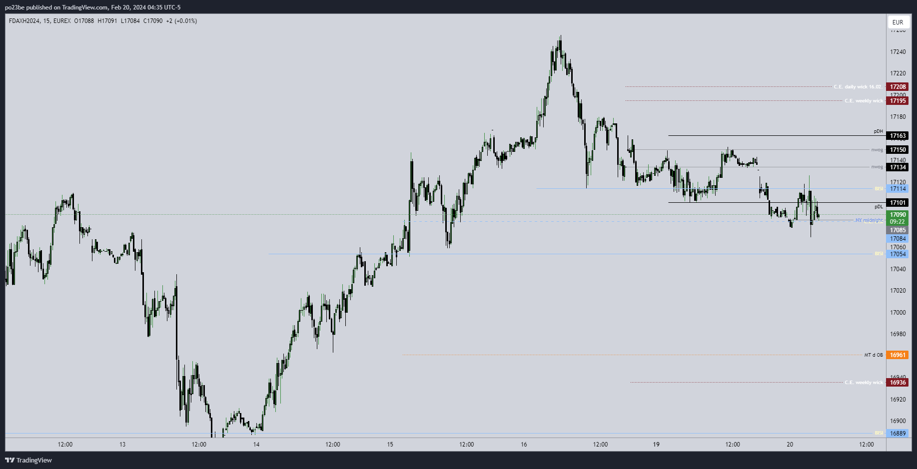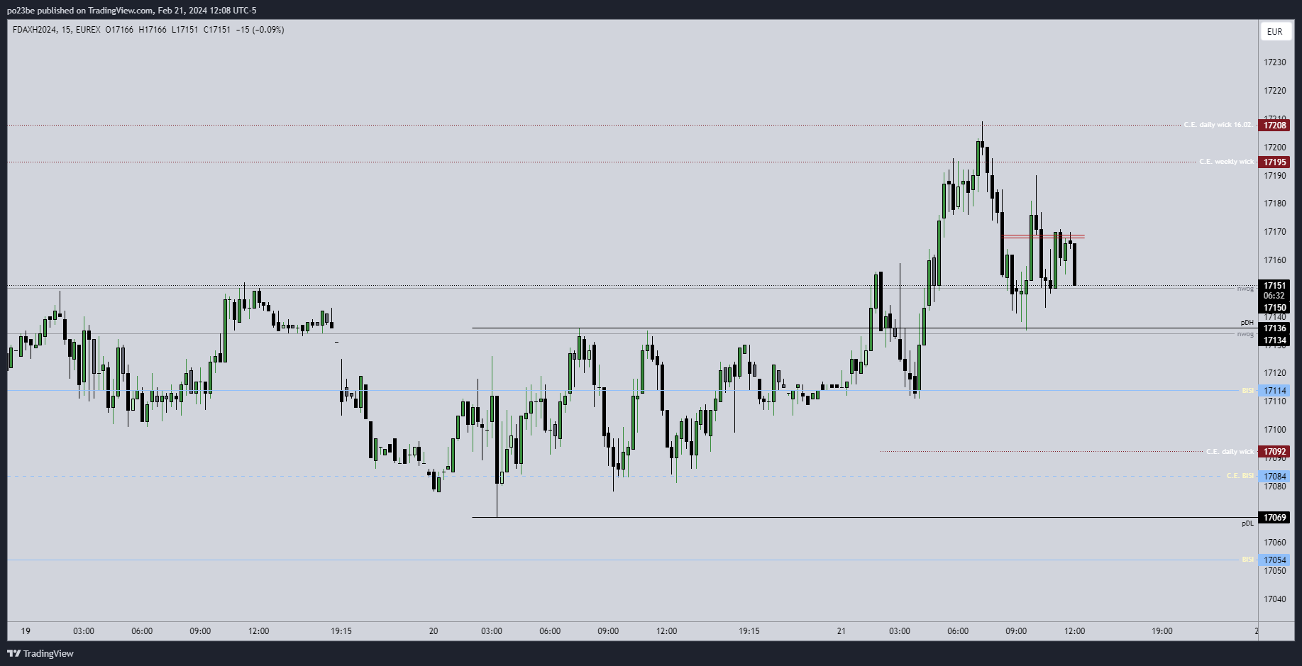 Er ist gerade in dem daily BISI 17054-17114 - theoretisch könnte er das als Sprungbrett wieder verwenden um nach oben zu laufen. Beim BISI unterhalb hat er es so gemacht - jedoch mit dem Unterschied, dass er oben die 17200 noch offen hatte... Wird nicht mehr viel passieren heute denke ich - morgen sind auch keine red folder news. Am Mittwoch fomc minutes - die sind auch nicht sonderlich spektakulär. Werde somit heute und morgen einfach mal abwarten