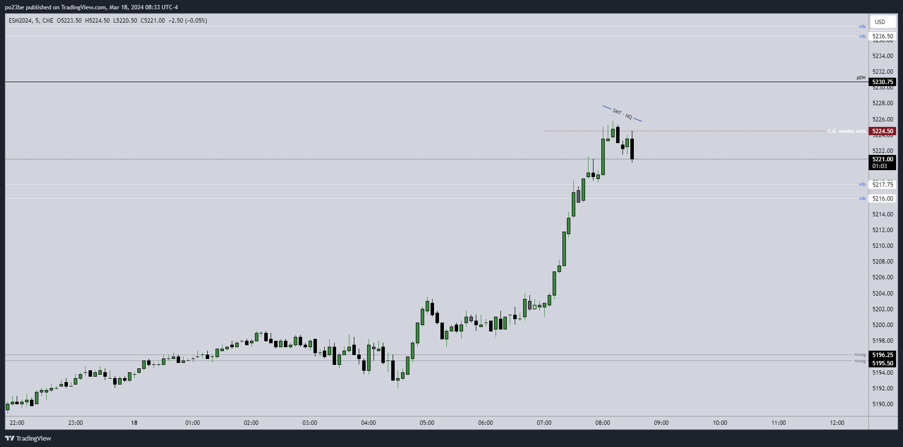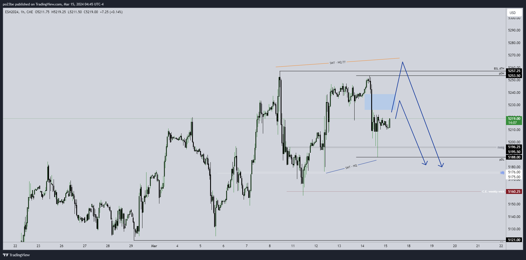 Am Tief gibt es eine SMT mit ES. Das wäre normalerweise bullisch..  Ich gehe aber davon aus, dass ES die "sick sister" (wie ICT es nennen würde) ist und das nach unten nachholen wird.