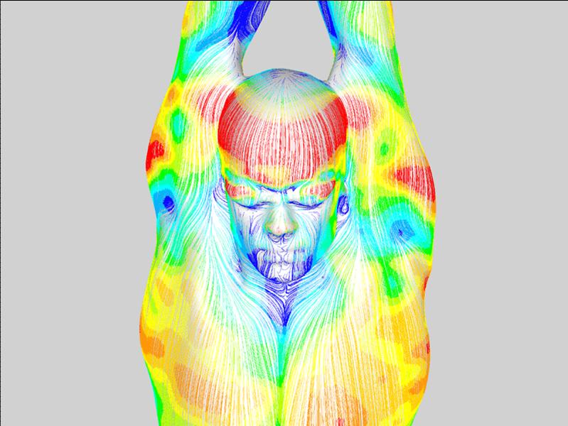 CFD modeling shows how the water flows around the body. Different suits are designed for male and female athletes because CFD has determined there is a more separated flow, where the water actually leaves the surface of the swimmer, for females than males.