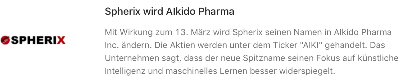 | NEW YORK, 25.02.2020 /PRNewswire/ — Spherix Incorporated (Nasdaq:SPEX) gab heute seine Teilnahme am AI & ML Drug Discovery Summit bekannt. Der AI-ML-Gipfel zur Entwicklung von Medikamenten ist die einzige Konferenz, auf der führende Vertreter der Industrie, Technologieexperten und Wissenschaftler zusammenkommen, die sich mit der Verbesserung der FuE-Prozesse durch den Einsatz von künstlicher Intelligenz und maschinellem Lernen befassen. Die Veranstaltung, die für den 24. und 26. Februar 2020 im DoubleTree by Hilton Hotel San Diego - Mission Valley geplant ist, bringt Branchenführer und Wissenschaftler zusammen, die technologische Lösungen für einige der größten Probleme von Pharma entwickeln und umsetzen. |