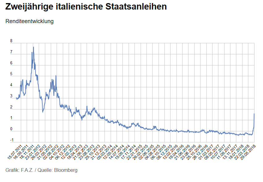 Die Euro-Ängste kommen mit großen Schritten zurück“, sagt Manfred Hübner, Geschäftsführer des Analysehauses Sentix. „Und es ist vor allem Italien, das als Austrittskandidat mehr und mehr in den Mittelpunkt rückt.“ Mit Umfragen nimmt Hübners Institut den Puls der Finanzmärkte auf, ermittelt, wie die Stimmungen und Wahrscheinlichkeiten ausschlagen. Monatlich werden dazu mehr als 1000 institutionelle und private Börsenprofis befragt.