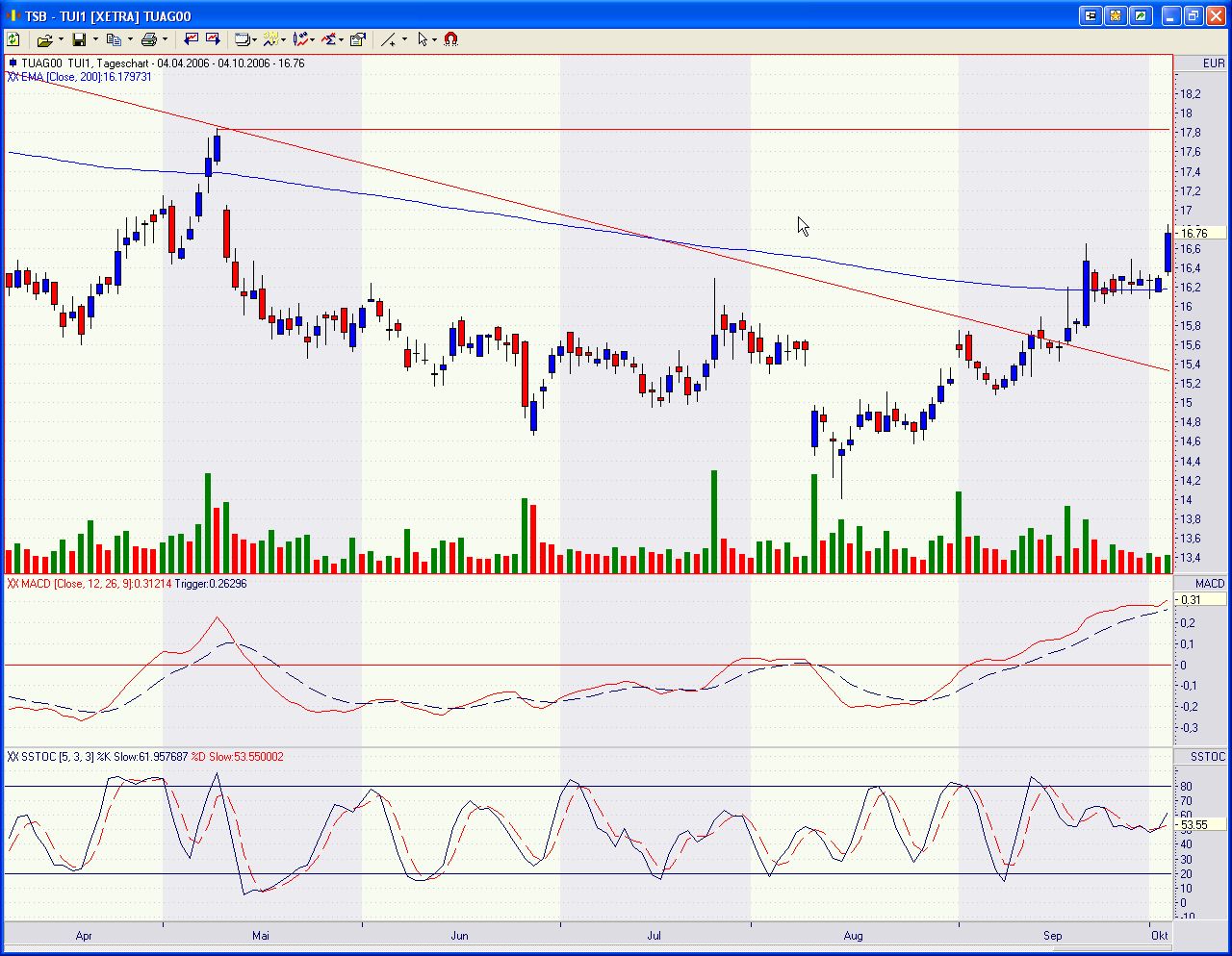 Darauf erkennt man den Break des im Juli 2005 bei knapp 23,-EURO eingeläuteten Abwärtstrends. Gleichzeitig erfolgte der Break der 100-Tage-Linie; seit heute