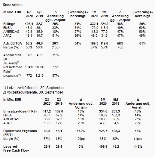 - Fakturierte Umsätze (Billings) wachsen in Q3 2020 um 29% (34% währungsbereinigt) auf 106,4 Mio. EUR und in 9M 2020 um 48% (50% währungsbereinigt) auf 332,1 Mio. EUR