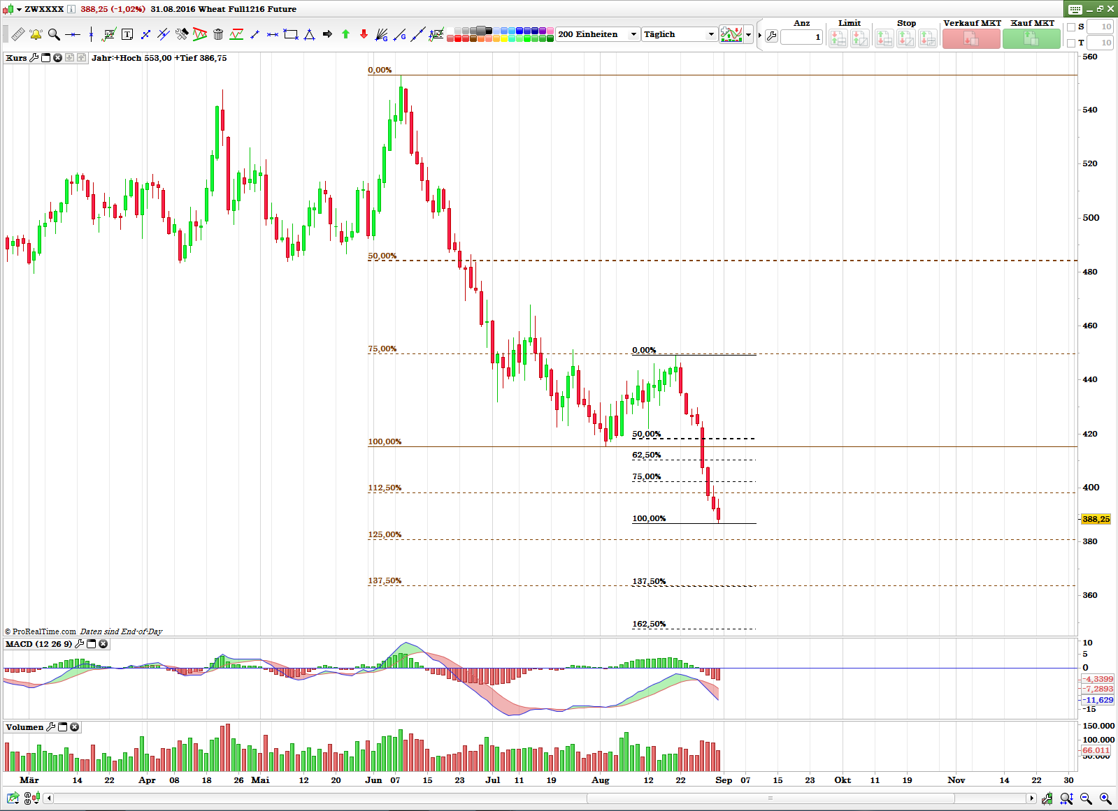Grundlegendes: ich persönlich finde, dass wir beide unterschiedliche Strategien verfolgen. Koregiere mich wenn ich falsch liege. Du hast eine Vorstellung von einem Wert, schäzt die Warscheinlichkeit und spekulierst auf diese. Ich gehe anderen Weg. Ich habe meine Vorstellungen, wie ein Wert entwickeln könnte, schätze die Warscheinlichkeit (Plan A, Plan B usw.) und warte auf Bestätigungen dieser Warscheinlichkeit. Erst dann agiere ich nach bestimmten Regeln. Unser Beispiel: Weizen. Ich gehe davon aus, dass Weizen bis zu bestimmten Marken weiter runter geht und weil Zyklus sein Tief im September macht und Weizen tatsächlich dem Verlauf, bis jetzt folgt, erhöhe ich die Warscheinlichkeit auf, sagen wir 60%. Wobei "Behavioral Finance" würde in diesem Fall von 50/50 sprechen :-) Habe ich "Glück" :-) und Weizenpreis tatsächlich bis zu diesen Marken sinkt und dort versucht Boden zu bilden, werde ich warten bis meine Handelsregeln "sagen" - jetzt aber Long. Ich stemme mich nicht gegen den Markt, den Markt hat immer Recht und entweder lag ich mit meinen Einschätzungen richtig oder ich lag falsch. Übrigens, dieses "Falsch" zu erkennen und Fehler zu koregieren ist am schwersten - liegt aber an unserer Psyche :-)