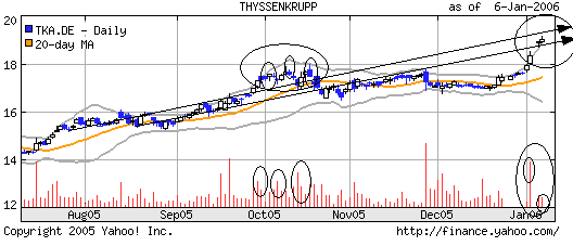 Nach Ansicht der Analysten sei der Konzern ins Geschäftsjahr 2005/06 überraschend gut gestartet. Mittelfristig würden sich die allgemeinen Konjunkturperspektiven angesichts der anziehenden Industriekonjunktur weiter aufhellen. Hiervon dürfte der Konzern stärker als bislang erwartet profitieren. Für den weiteren Jahresverlauf sehe ThyssenKrupp eine steigende Stahlproduktion, da die Nachfrage nicht nur in USA und Fernost hoch bleibe, sondern sich auch in Europa verbessere. Außerdem habe sich die Lagerhaltung bei den Abnehmern wieder normalisiert. Deshalb habe der Konzern zuletzt angekündigt, für Flachstahl die Preise zum 1. April erneut anzuheben (um mind. 20 EUR je Tonne).