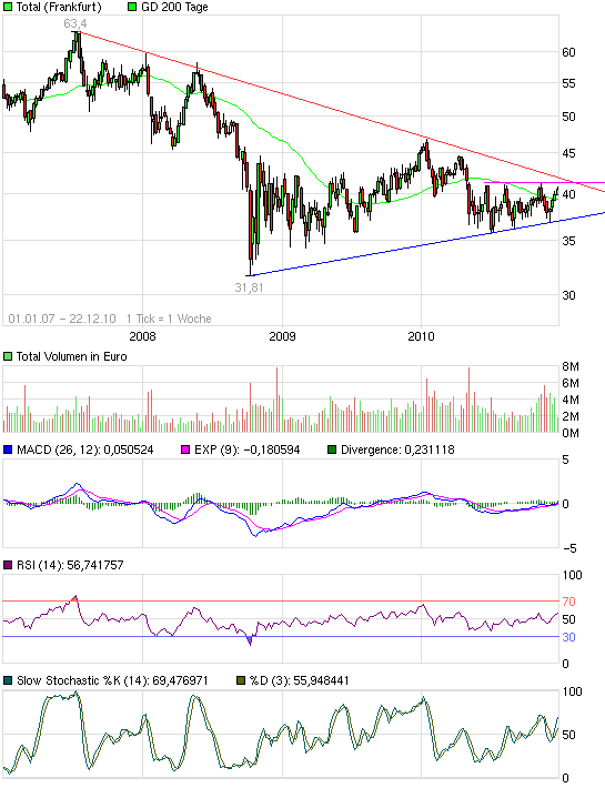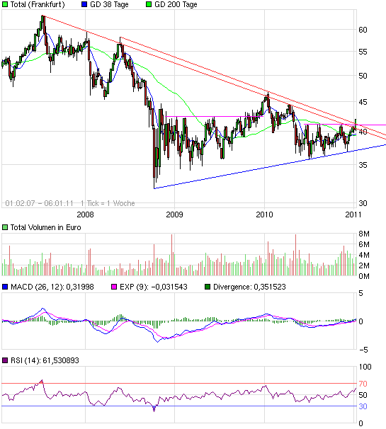 Ist natürlich ein Brett, was da vor uns liegt, genau wie ich gesagt habe, nur eine Grafik untermauert das natürlich! Ich sehe dem Ganzen jedoch trotz scheinbar unüberwindlicher Hürden positiv gegenüber. TOTAL erkennt, dass konventionelles Öl nicht alles ist (Stichwort "Ölsand") und investiert viel in Afrika. Das alles zeigt Weitblick, wird sich jedoch momentan nicht positiv widerspiegeln. Ein sehr großer Pluspunkt ist natürlich die Dividende, vor allem, wenn sie nächstes Jahr quartalsweise ausgeschüttet wird. Wenn das alles mal nachhaltig erkannt wird, wird der Aktienkurs. Doch wie gesagt: WENN! Was man charttechnisch noch sagen kann ist, dass sich das Chartbild auch auf andere französische Aktien projezieren lässt. Gute Unterstützung, jedoch auch große Widerstände. Da fragt man sich natürlich, warum man in solche Unternehmen einsteigen soll. Die Antwort hier lautet: Nachhaltigkeit. Französische Unternehmen im Allgemeinen sind in Afrika gut aufgestellt, in den sogenannten "Frontier Markets". Für alle, denen das nichts sagt: Das sind die Schwellenländer von morgen. Außerdem zahlen die französischen Unternehmen gute Dividenden, was vor allem für Langzeitinvestoren interessant ist. Die Dividendenzahler stürzen in einer Krise auch nicht zu tief ab, man vergleiche da z.B. TOTAL mit dem DAX. Ein weiterer positiver Punkt: Die Dividenden dienen als Puffer für Rückschläge. Es lässt sich also festhalten, dass die Dividendenzahler eine wahre Kursbereicherung sind, vor allem auf lange Sicht. TOTAl ost auf jeden Fall vorne mit dabei und wenn der Markt das erkennt, wird es auch hier wieder bergauf. Sollten wir die 41 heute nicht schaffen, schaffen wir sie vllt. morgen oder auch nächstes Jahr. Ich jedenfalls habe Zeit und hoffe, dass ihr sie auch habt. Gute Geschäftsmodelle verdienen Geduld bei den Investoren, d.h. für uns als TOTAL-Aktionäre: GEDULD,GEDULD,GEDULD! |
