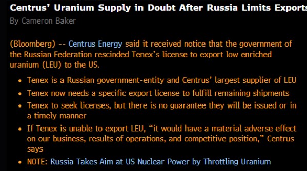 Die Rallye kam, nachdem Russland beschlossen hat, die Exporte von angereichertem Kernbrennstoff in die USA zu begrenzen, was das weltweite Angebot verknappt.