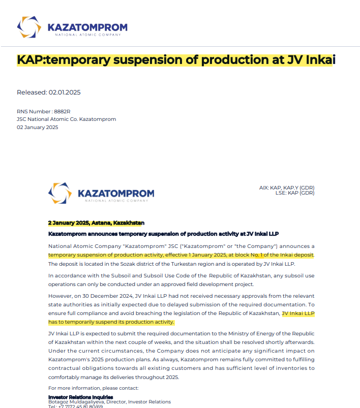 Rosatom verkauft seinen Anteil am größten unerschlossenen Vorkommen an die Chinesen. Reduziert Sanktionsrisiken für KAZ. Könnte Druck auf Spotpreis erklären, wenn die Chinesen das zügig ausbeuten könnten sie den Handelspreis drücken.