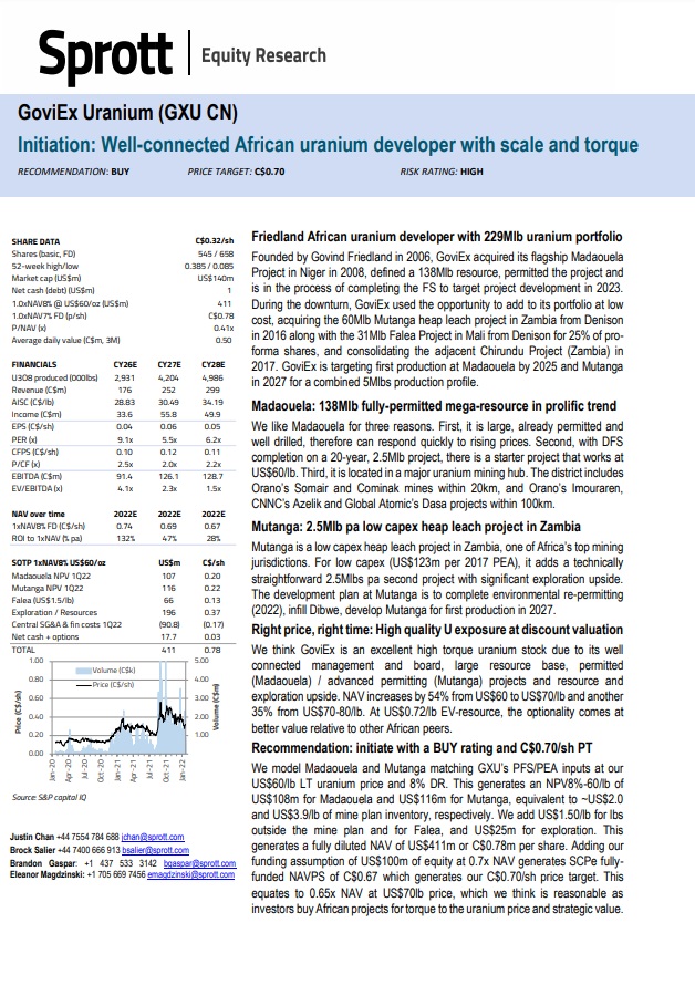 (TSXV:STND, BUY (S), David A. Talbot) has commenced an initial drill program on its 100%-owned Sun Dog uranium project in the NW Athabasca Basin. It will consist of ~10 diamond drill holes (3,000m) to follow up on high-grade uranium mineralization, while high-resolution ground gravity and UAV magnetic surveys are expected to refine existing high-priority drill targets. This drilling campaign should focus on the Skye, Haven, and Java target areas, and should explore several kilometers of graphitic conductors coincident with cross-cutting faults and historical surface and drill hole intersections of high-grade uranium mineralization. It will also test the down-dip extensions of structures hosting mineralization at surface with the aim of discovering high-grade basement mineralizing systems underlying the Athabasca sandstones. Ice road access to the project is currently underway, and geologists and drill crews are due to mobilize by the last week of February 2022. Drilling is expected to commence during the first week of March 2022. Sun Dog hosts all of the favorable characteristics of an Athabasca-style unconformity-related uranium deposit, and despite positive historical exploration results, the project has not been drill tested in 14 years. For more information on final assays from the company’s most recent summer drill program, please see our most recent notable (read more). Moreover, Standard Uranium has appointed Sean McGrath as President, effective February 7, 2022. Mr. McGrath has over 25 years experience as a mining executive, conducting work at both exploration and producing-stage mining companies throughout his career. He will be working alongside the company’s CEO, Jon Bey, as Standard Uranium continues to advance its portfolio of uranium projects in the Athabasca Basin. Read more |