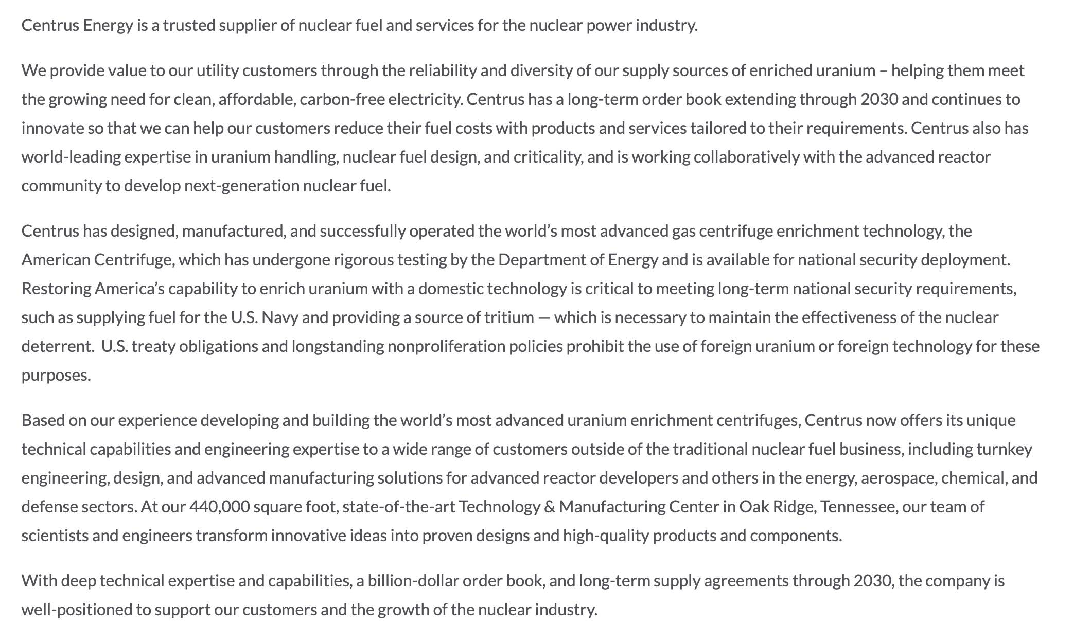Over the long term, the United States will need to deploy a domestic uranium enrichment technology at industrial scale. Centrus’ American Centrifuge technology is the only technology available now to restore this critical capability.