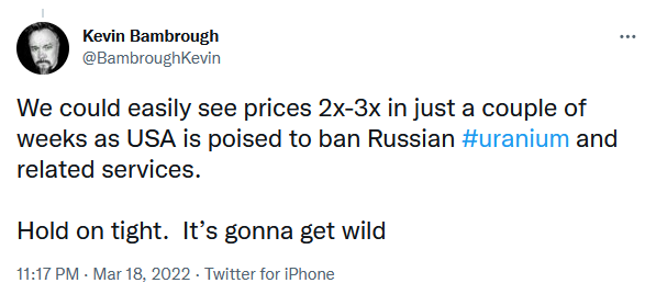 Das reicht eigentlich schon, aber jetzt kommt durch den Konflikt noch die Angst vor selbstauferlegten Sanktionen westlicher Nationen bzgl. russischem Rosatom (und evtl. Friends Kazatomprom) Uran dazu.