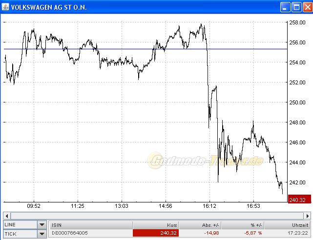 Auffällig ist auch, dass mit Hilfe der VW-Aktie der Dax nach oben oder unten getrieben wird: Soll der Dax um 3% steigen, wird kurzerhand die VW-Aktie um plus 10% von 230 auf 250 Euro gedrückt; soll der Dax runter wird die VW-Aktie auf 200 Euro herabgesetzt (das scheint wohl das untere limit zu sein). Pure Zockerbörse!