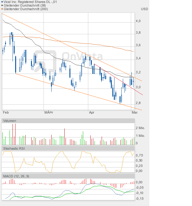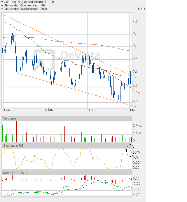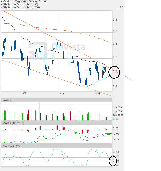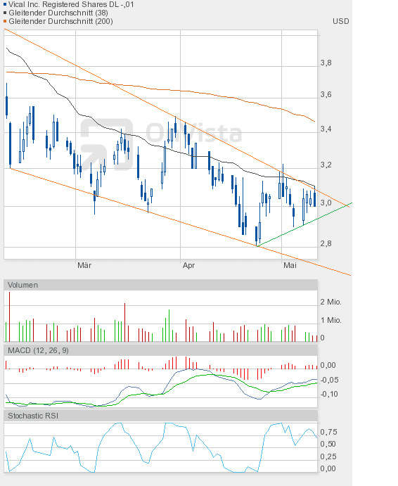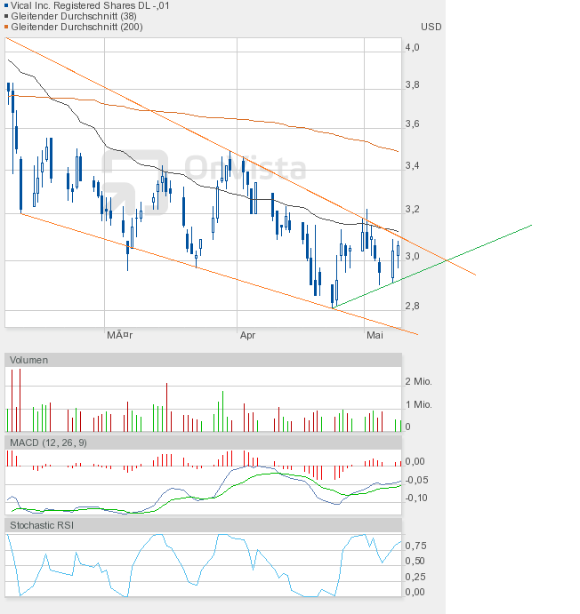 Wie man dem Chartbild entnehmen kann, steht die nächste Entscheidung vor der Tür. Wir sahen heute eine enge Handelsspanne, die sowohl Ober- als auch Unterbegrenzung des bullishen Keils annähernd auslotete. Kommt es in Kürze zum kleinen Ausbruch, also dem Fall unter die grüne Linie, dann wäre das auch kein Desaster, aber kurzfristig negativ. Und der Verbleib im bullishen Keil würde sich verlängern. Oder kommt es endlich zum großen Ausbruch, also zur Auflösung des bullishen Keils? Es dürfte dann eine Rallye-Phase beginnen. Ein Indiz dafür könnte der Stochastic RSI liefern, der sich heute auf 0,25 halbierte, obwohl Vical nur 1 US-Cent nachgegeben hatte. Schlusskurs 3,00$. Also Augen auf beim Eierkauf. |